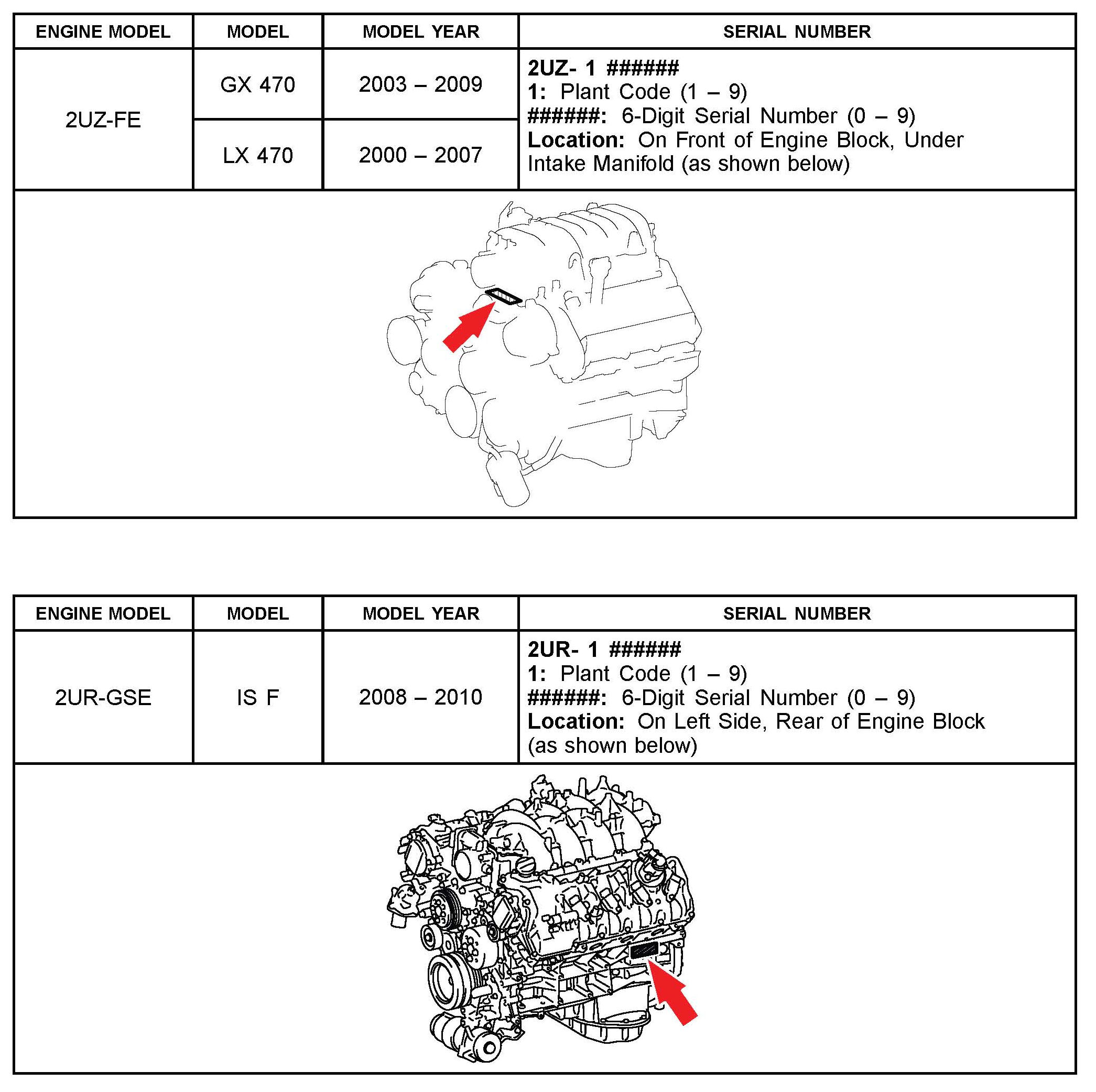 The purpose of this TSIB is to assist in the identification and location of engine serial numbers on 2000 - 2010 model year Lexus vehicles.