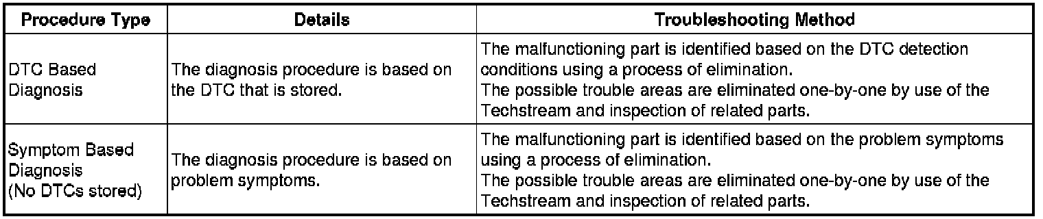 * The troubleshooting procedures consist of diagnosis procedures for when a DTC is stored and diagnosis procedures for when no DTC is stored. The basic idea is explained in the following table.