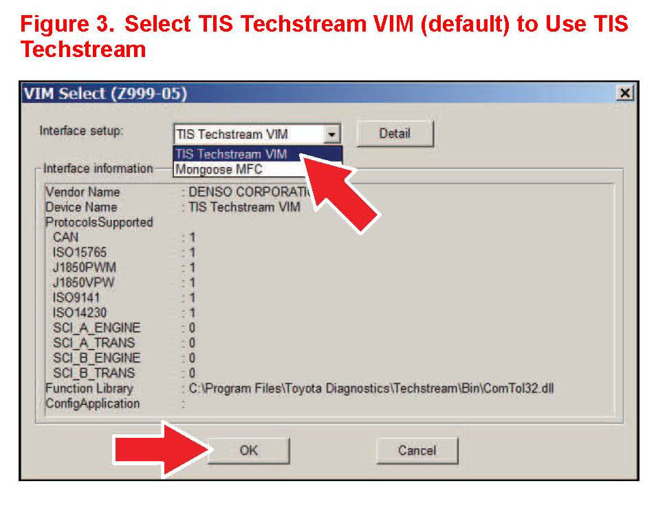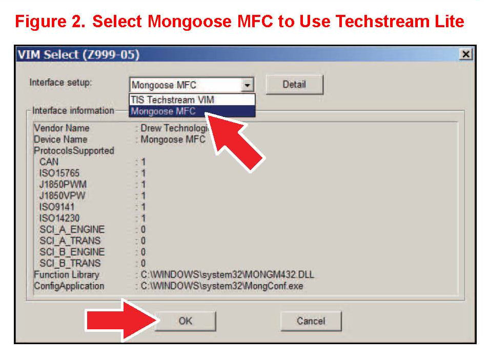 Selecting the TIS Techstream VIM or the Mongoose MFC VIM.