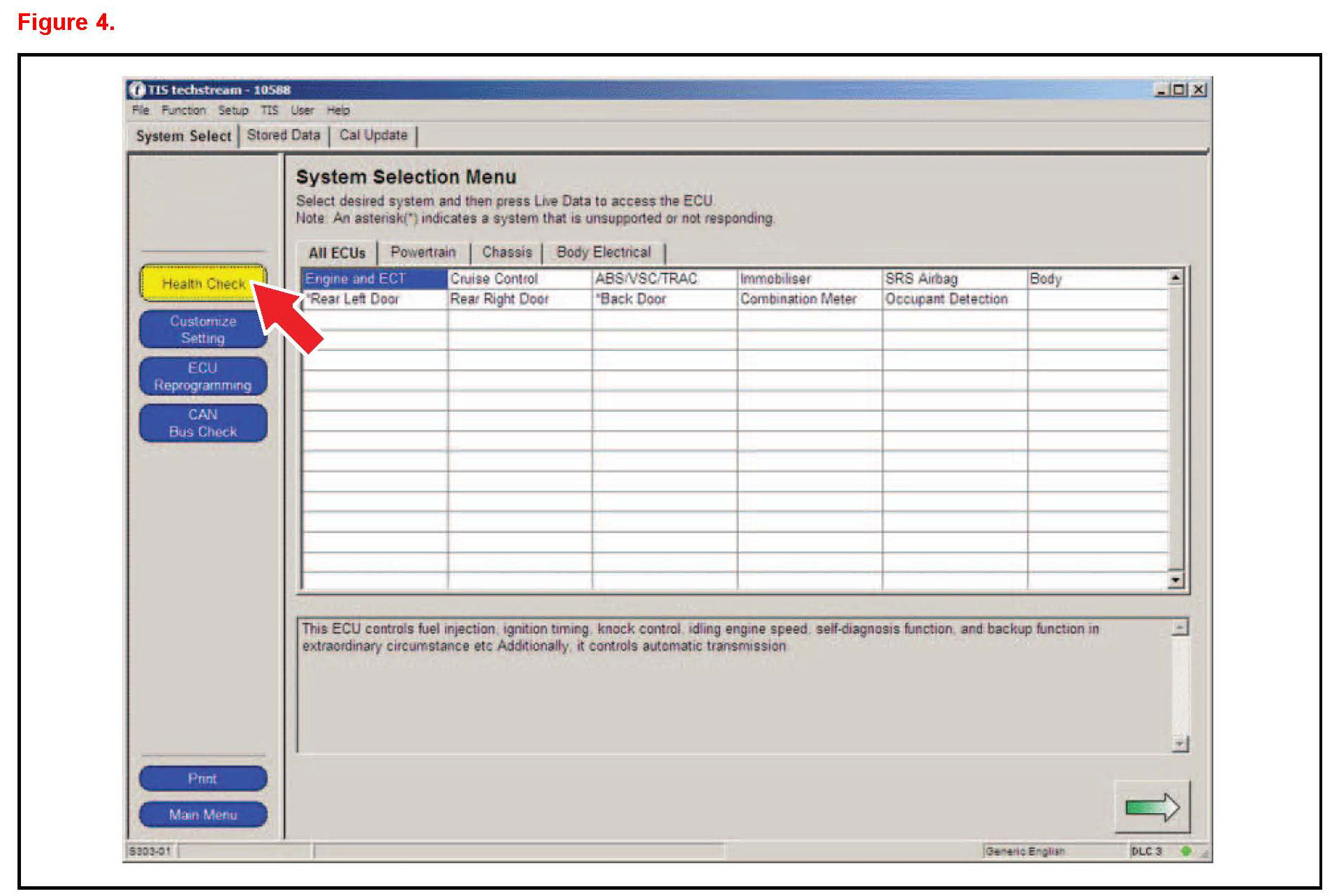 1. Verify the vehicle's applicability for recalibration and locate desired calibration file by performing the Techstream Health Check function.