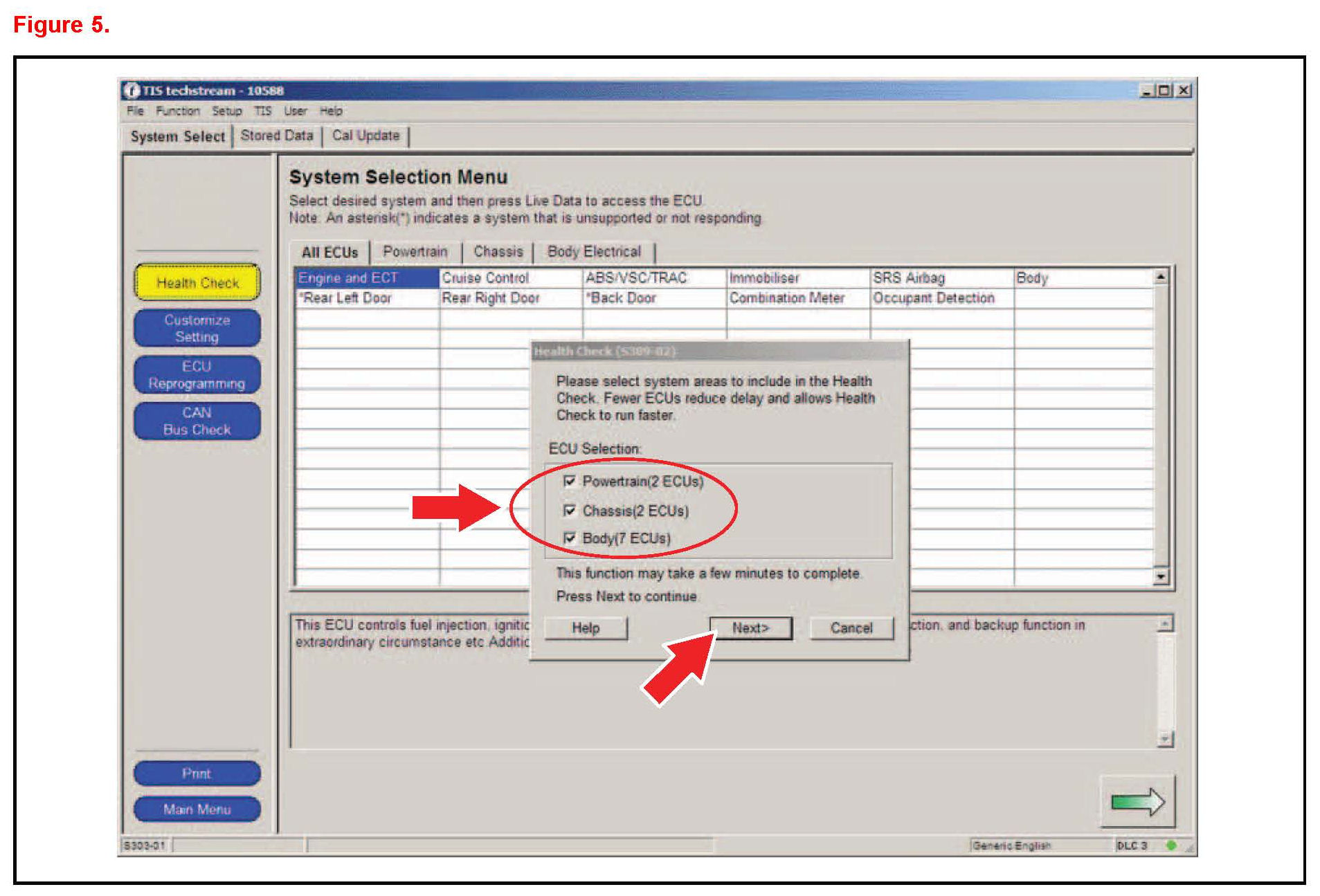 C. Choose desired ECU group(s) in the Health Check dialog box.