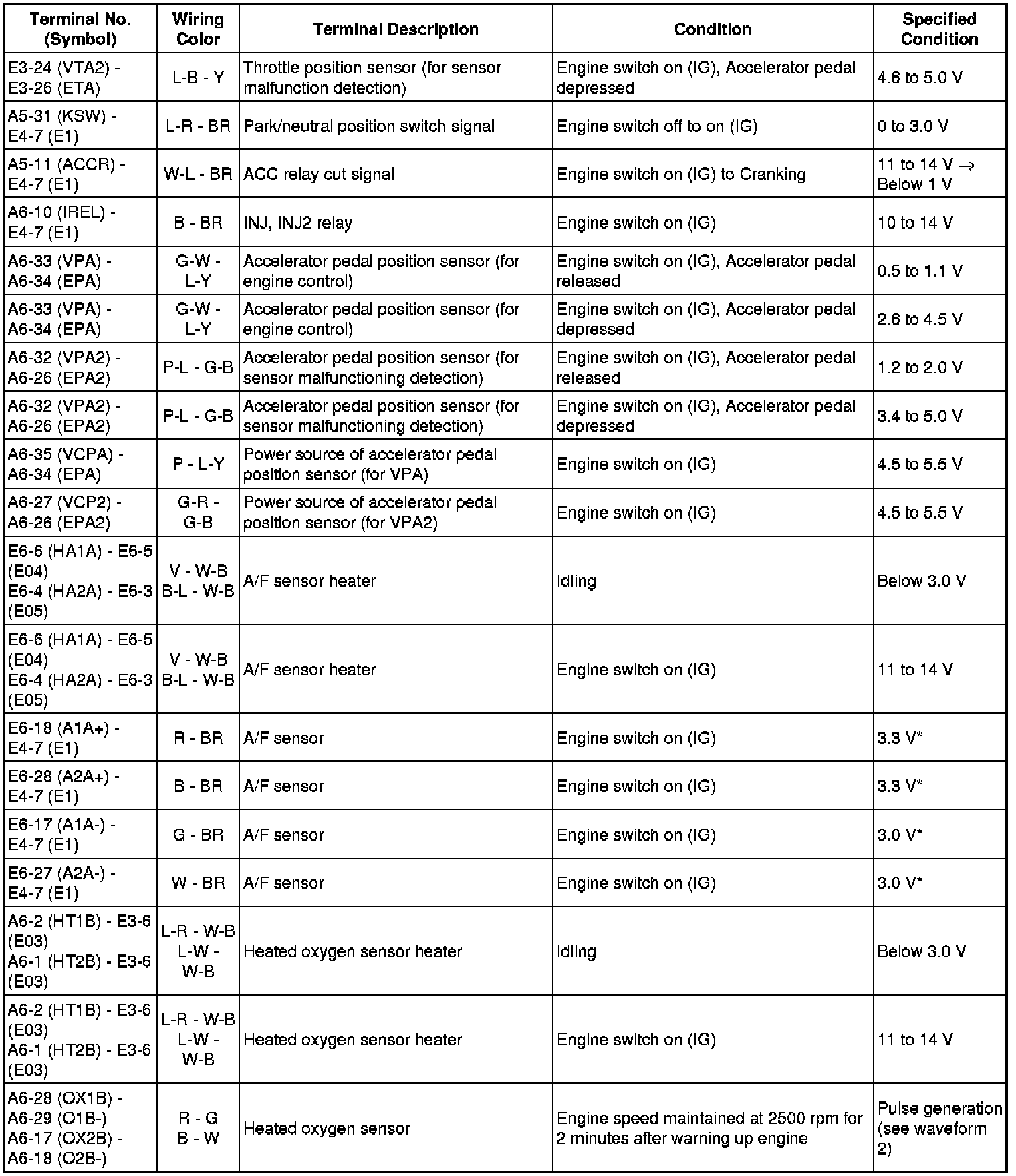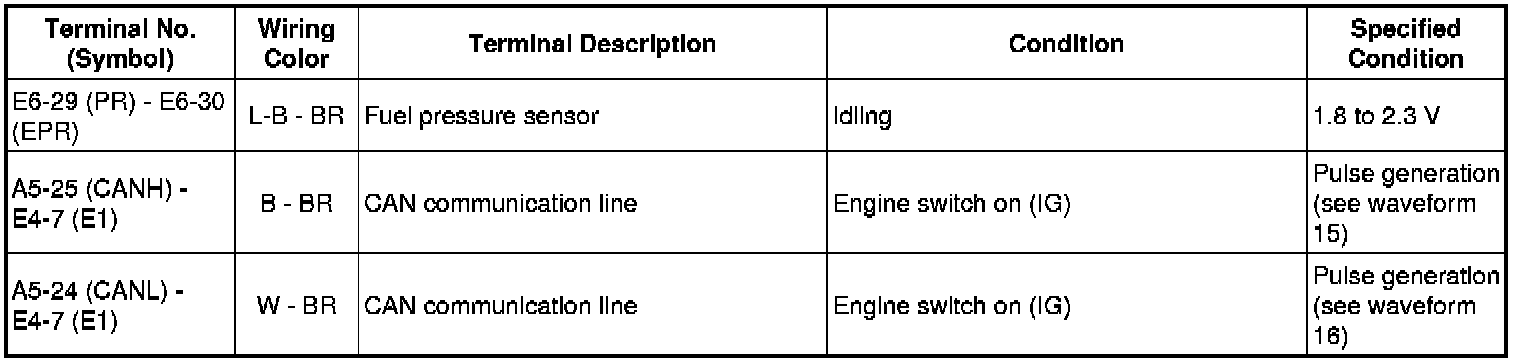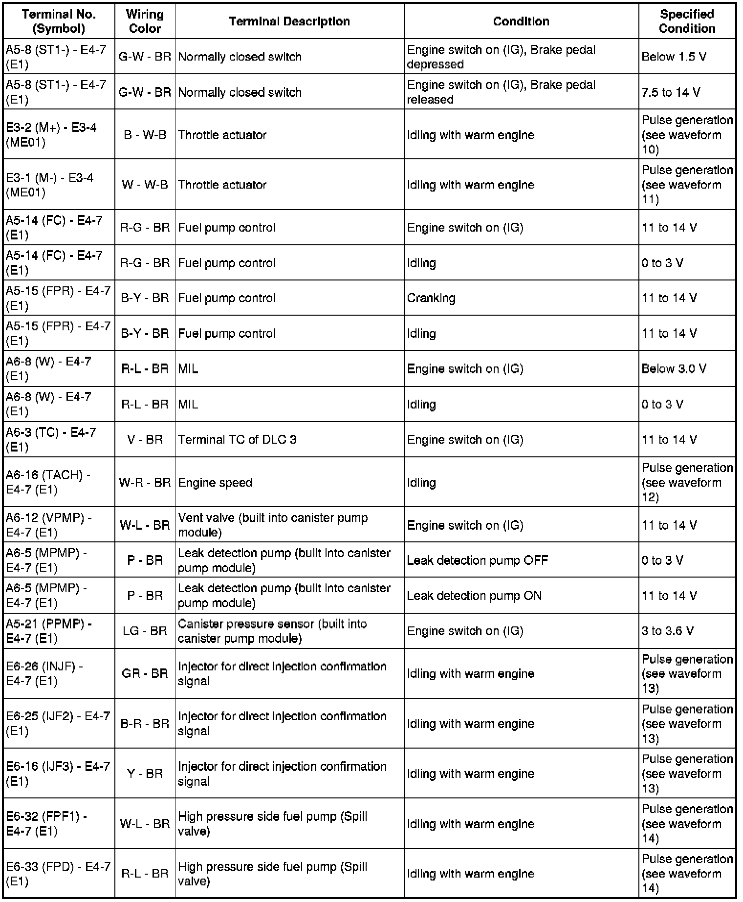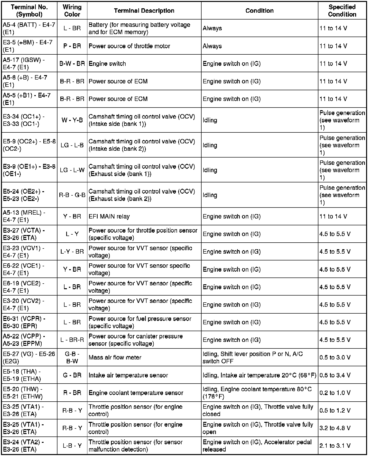The standard normal voltage between each pair of the ECM terminals is shown in the table below. The appropriate conditions for checking each pair of the terminals are also indicated. The result of checks should be compared with the standard normal voltage for that pair of terminals, displayed in the Specified Condition column. The illustration above can be used as a reference to identify the ECM terminal locations.