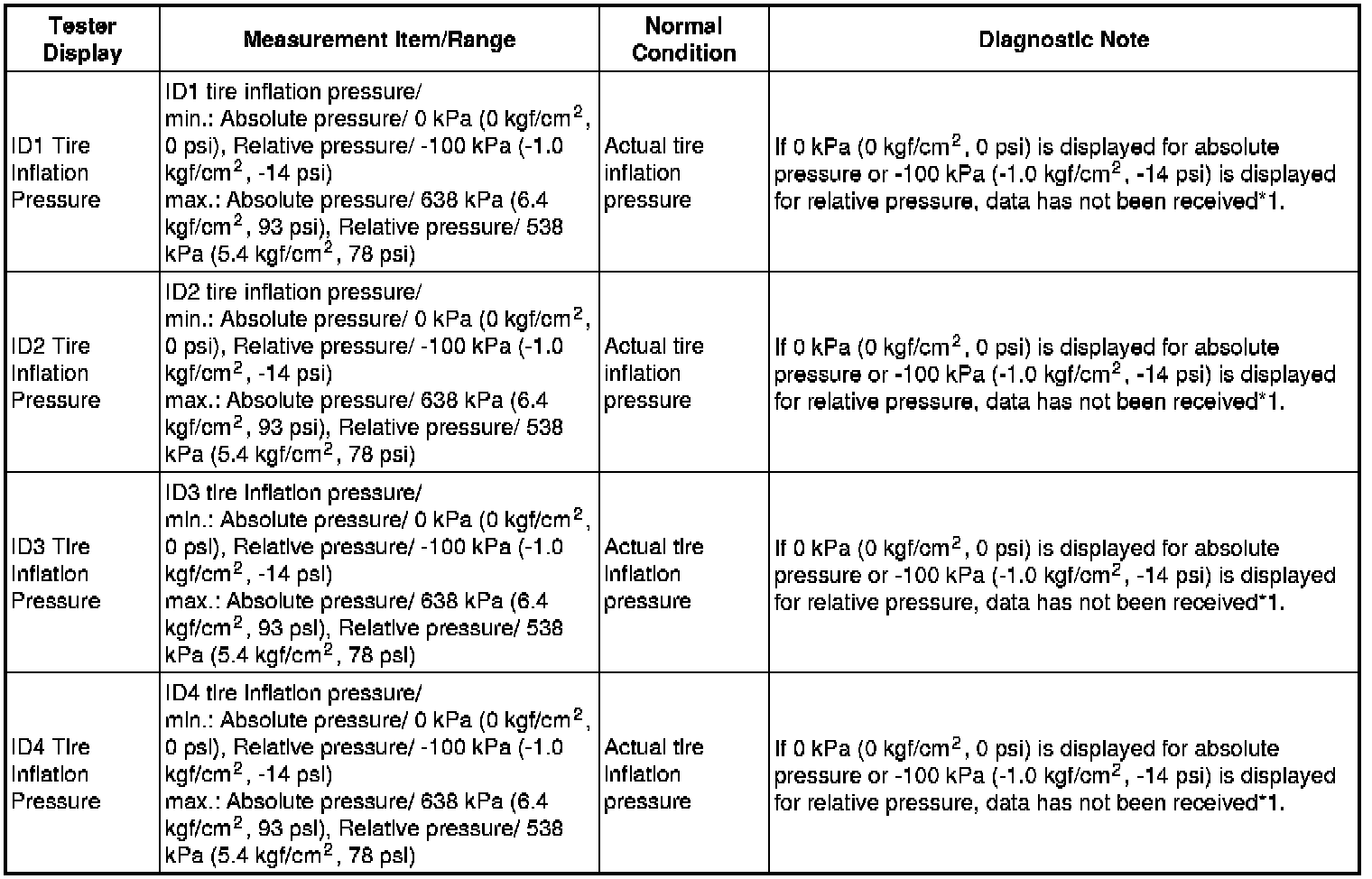 * Initialization is completed when the Data List "ID Tire Inflation Pressure" display shows the correct pressures.