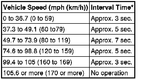 (3) As shown in the following table, the wiper operates once more after an interval time (between 3 to 7 seconds) determined based on the vehicle speed so that any washer fluid drips are wiped away. The speed signal used for this function is sent by the combination meter, and received by the main body ECU LH.