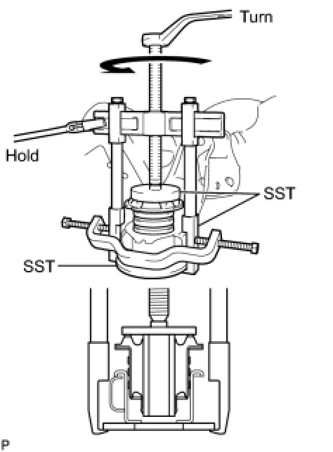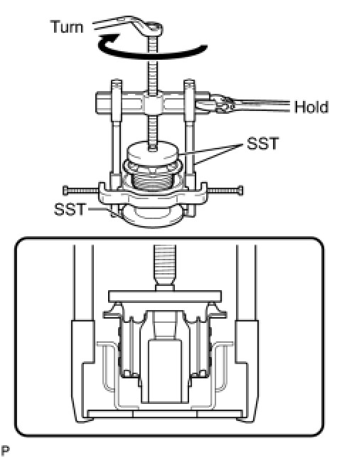 (c) Using SST, install the rear suspension member rear body mounting cushion until there is no clearance between the suspension member sub-assembly and rear suspension member rear body mounting cushion.