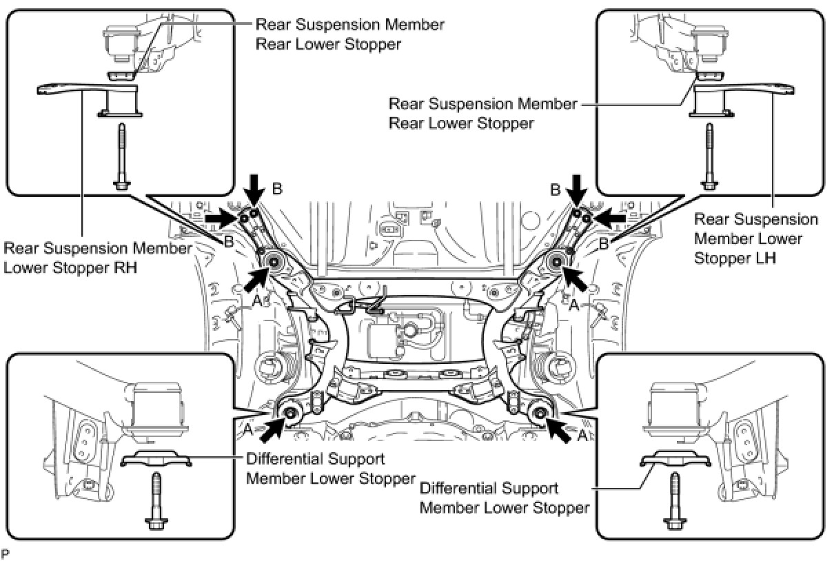 (b) Temporarily install the rear suspension member, 2 rear suspension member rear lower stoppers, 2 rear suspension member lower stoppers and differential support member lower stoppers with the 8 bolts.