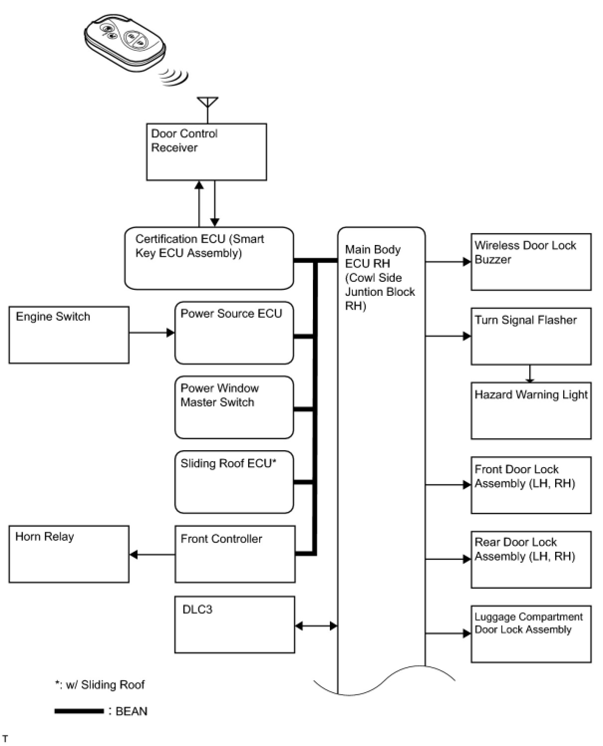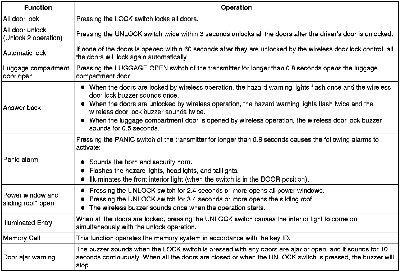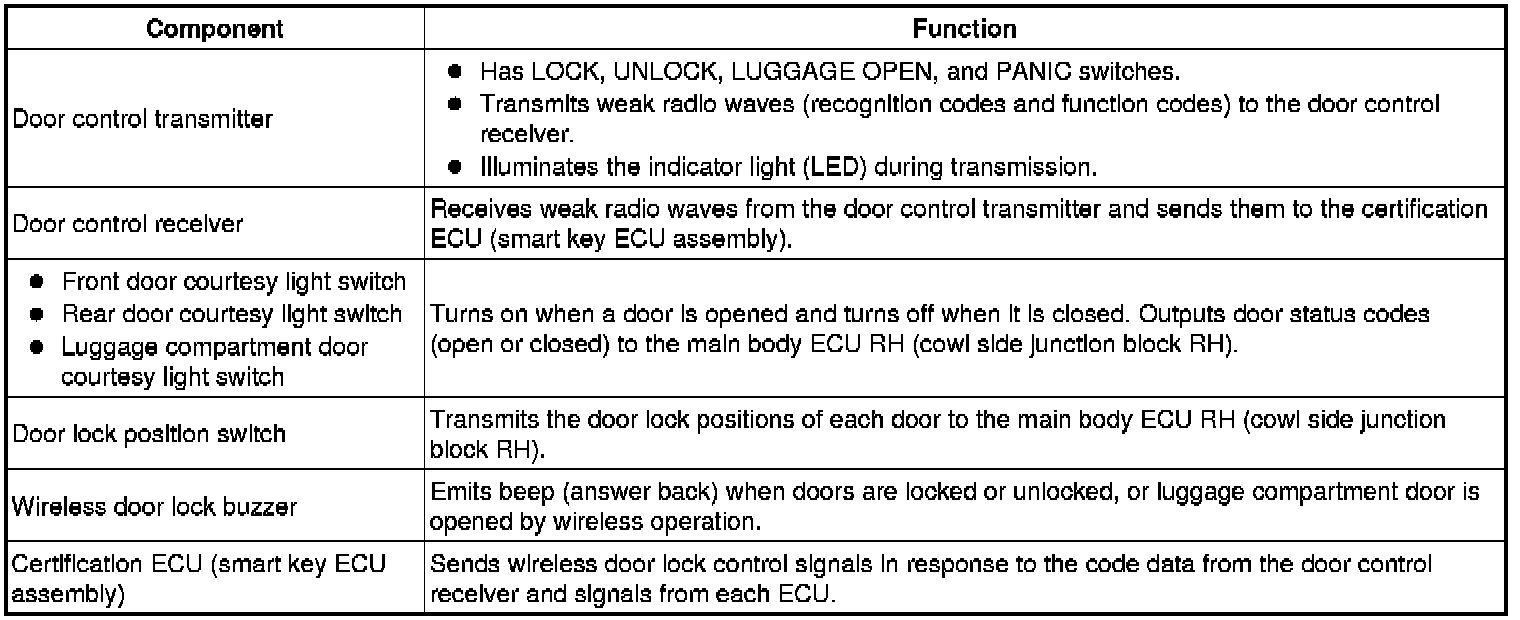 The wireless door lock control system functions to lock and unlock all the doors from a distance. The system is controlled by a hand-held transmitter which sends radio waves to the door control receiver. The main body ECU RH (cowl side junction block RH) performs an ID code identification process and engages the door lock control.