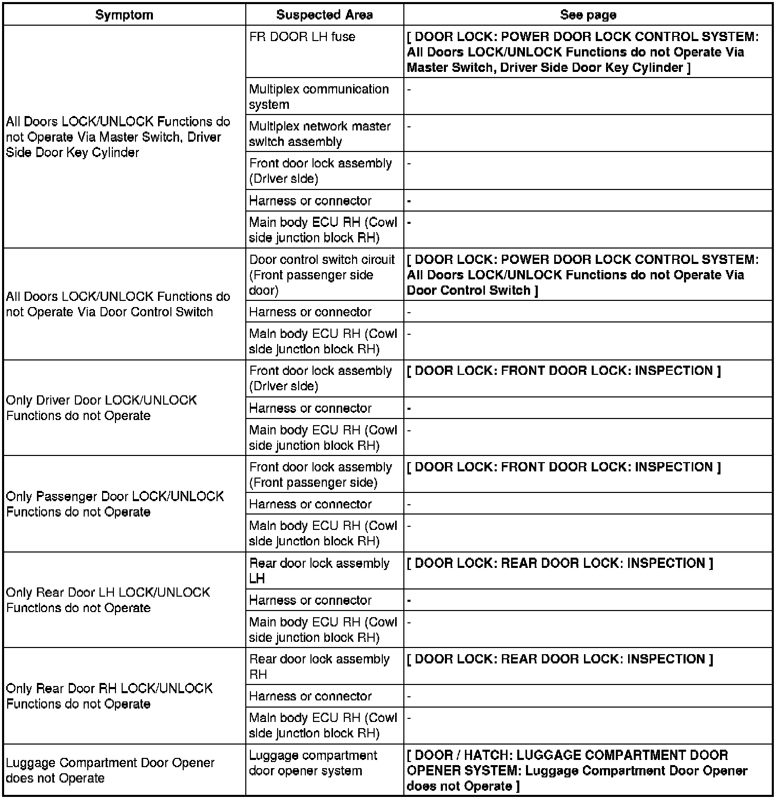 DOOR LOCK: POWER DOOR LOCK CONTROL SYSTEM: PROBLEM SYMPTOMS TABLE