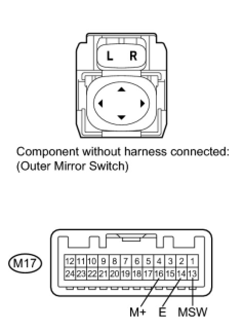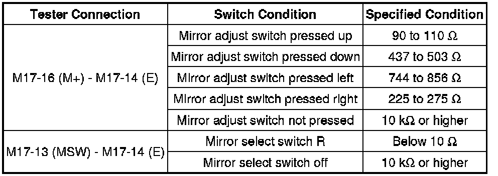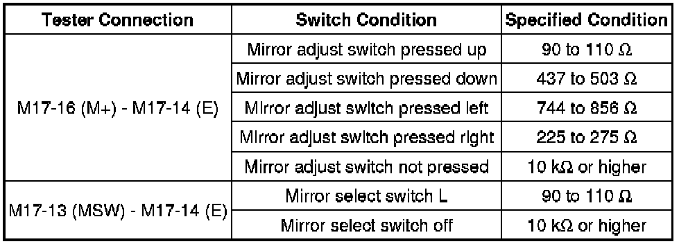 (1) If the result is not as specified, replace the outer mirror switch assembly.