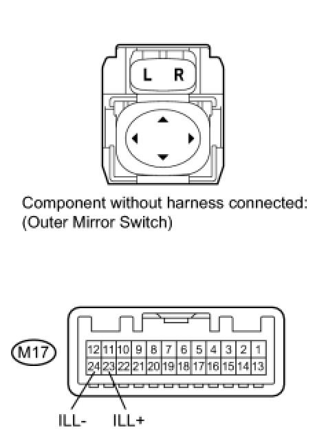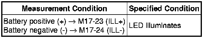 (1) Apply battery voltage to the outer mirror switch assembly and check that the LED illuminates.