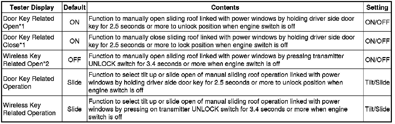 * *1: This function is linked with the power window key-linked function. If the power window key-linked function is set to OFF, the sliding roof key-linked function will not operate even when it is set to ON.