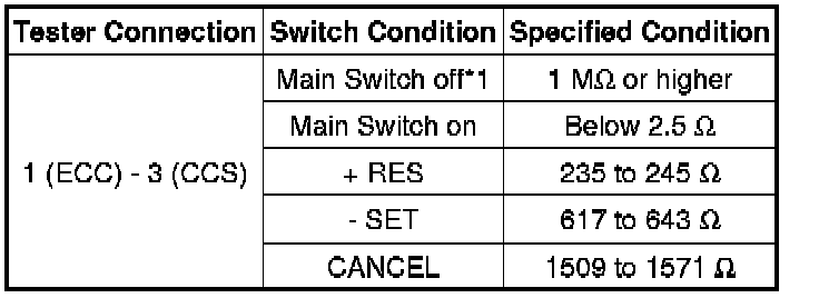 If the result is not as specified, replace the cruise control main switch.