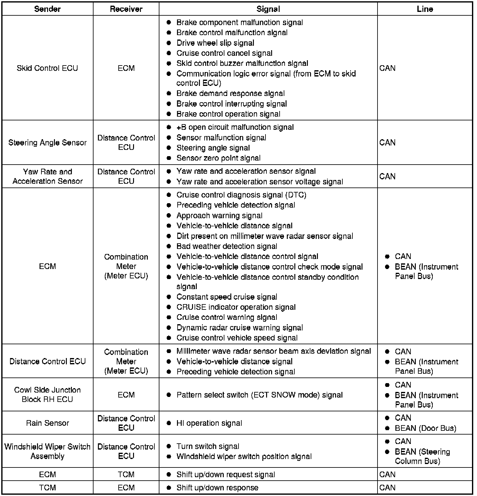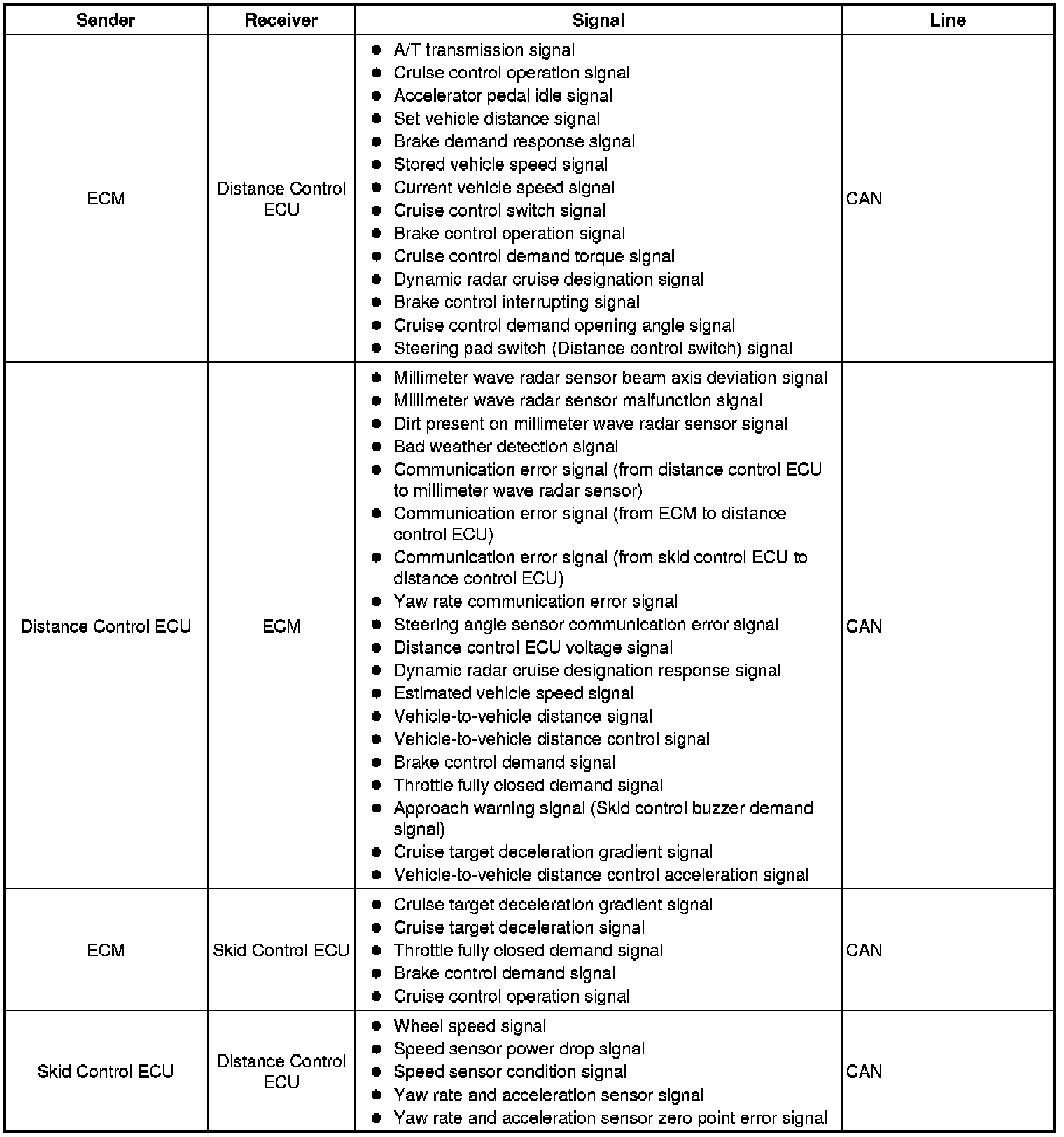 The distance control ECU determines the distance to the vehicle in front, relative speed, target decreasing speed, and deceleration rate. Based on these data, the ECU transmits a brake demand signal to the skid control ECU via the ECM.