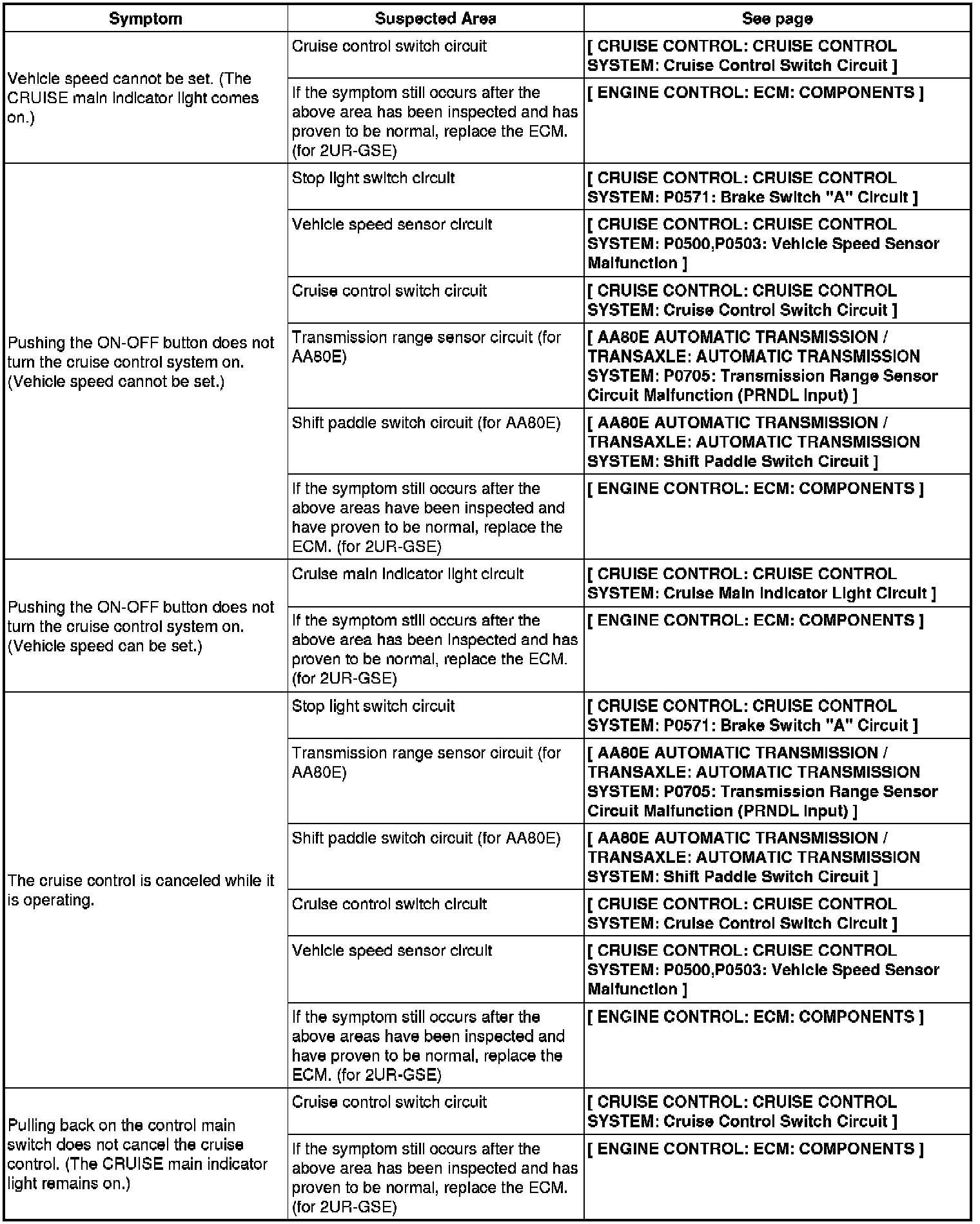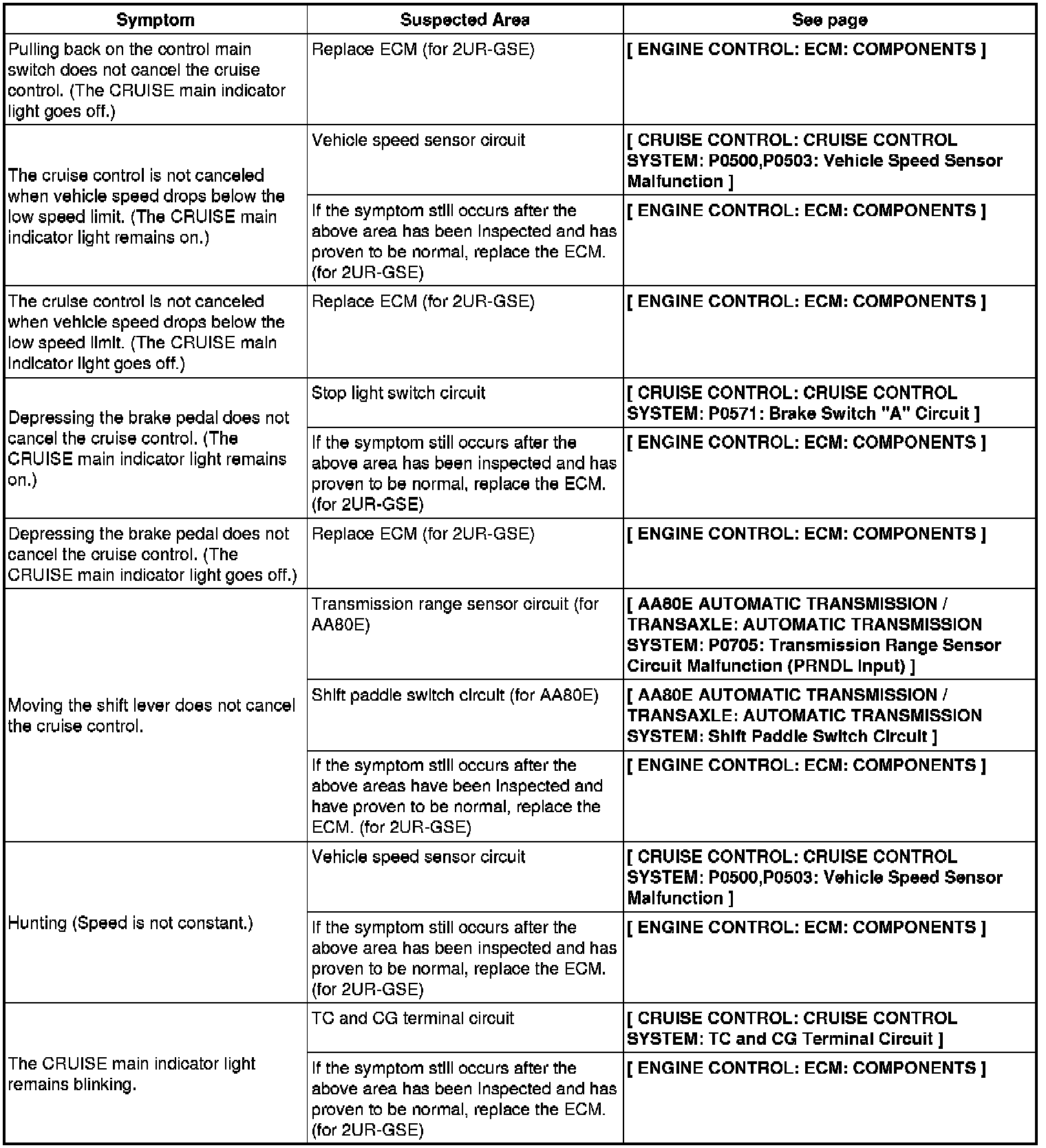 CRUISE CONTROL: CRUISE CONTROL SYSTEM: PROBLEM SYMPTOMS TABLE