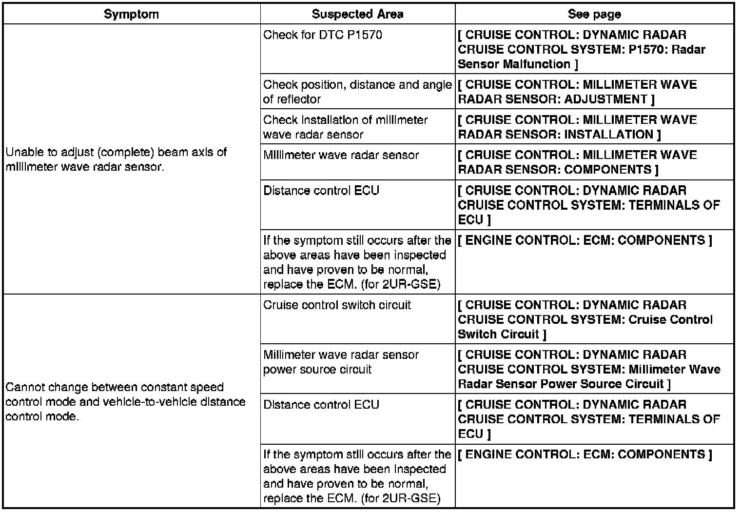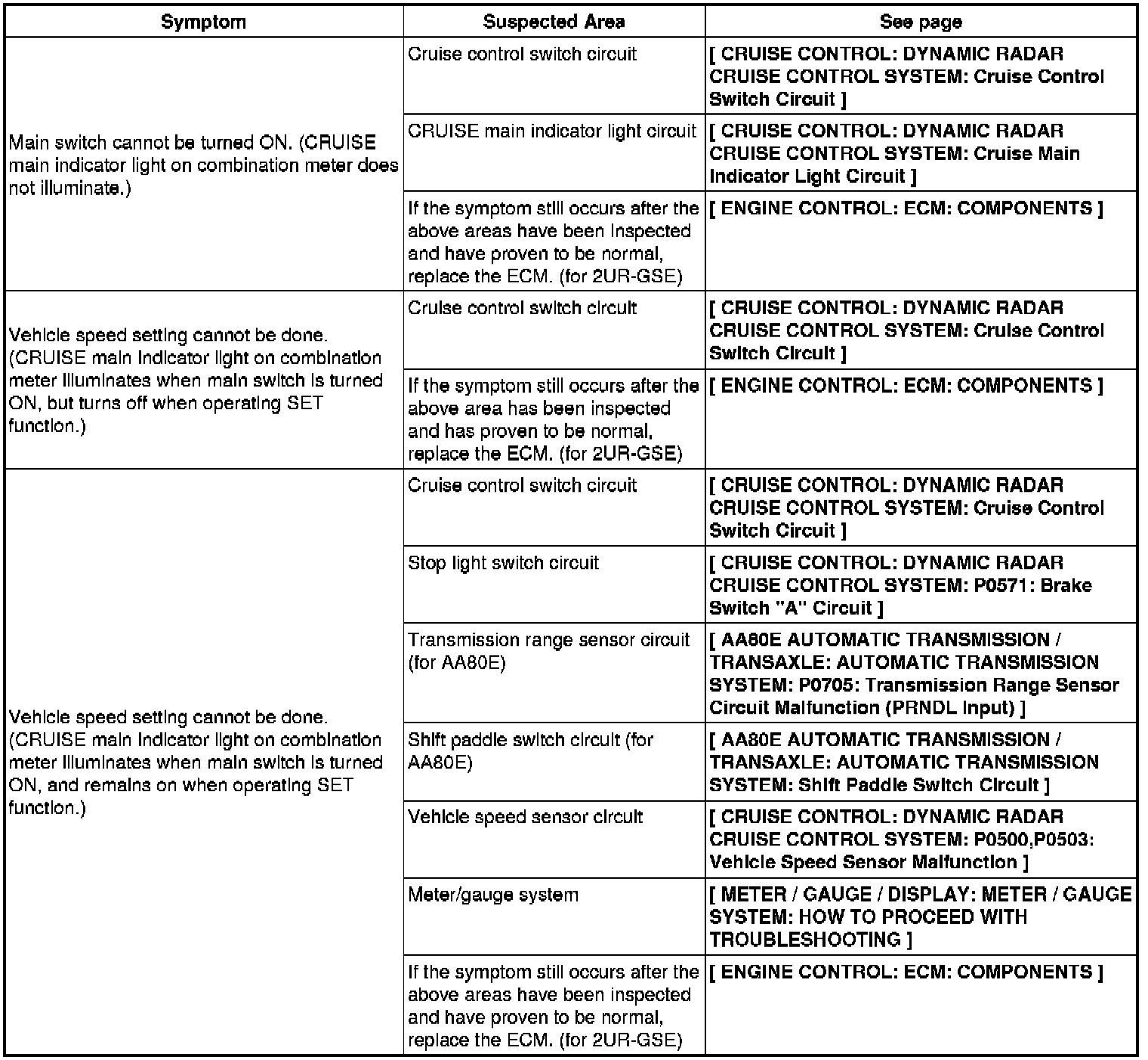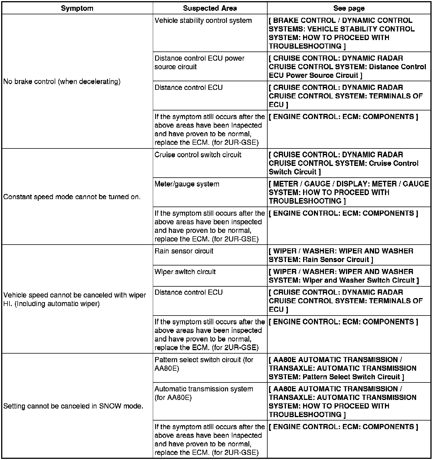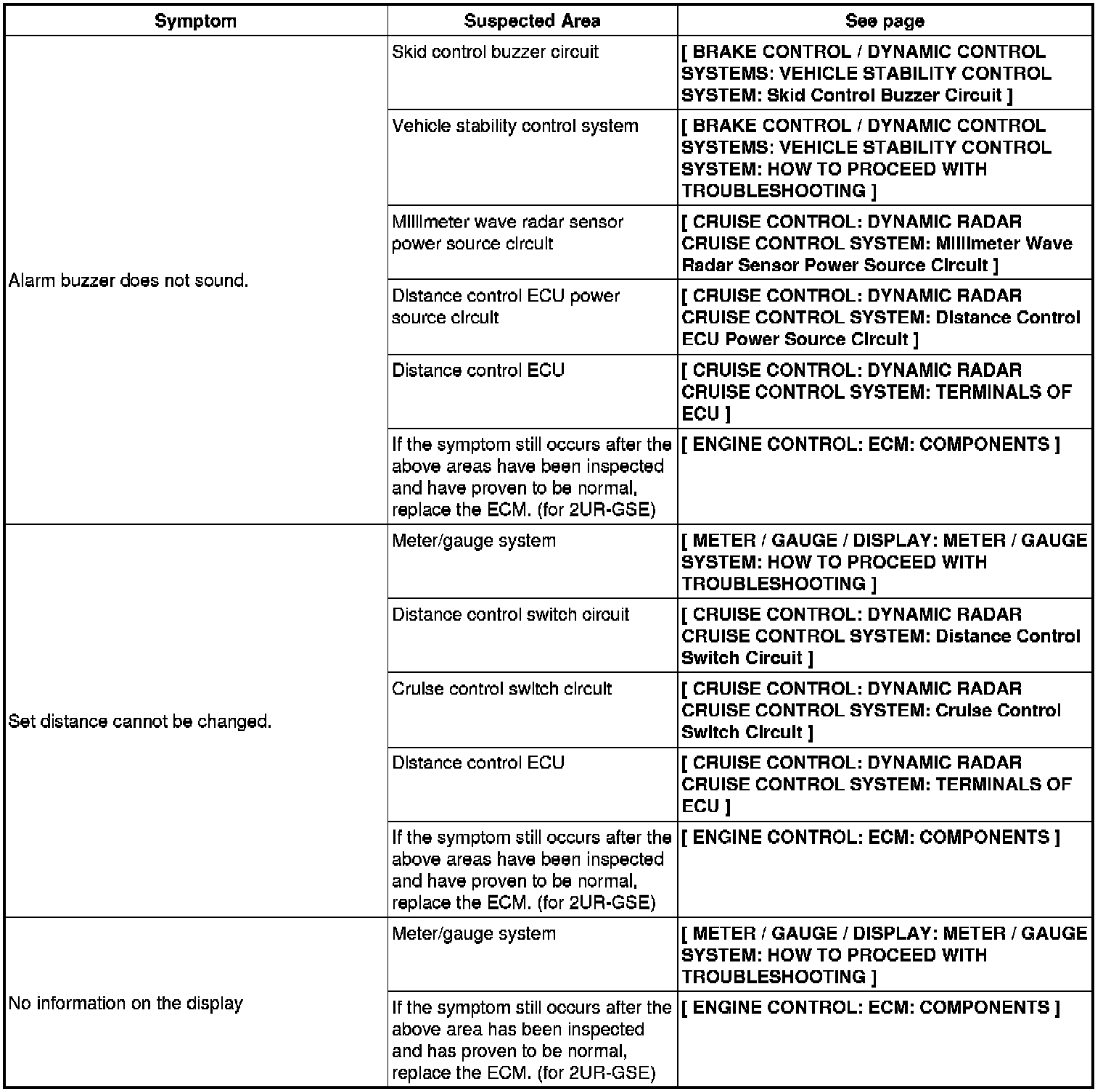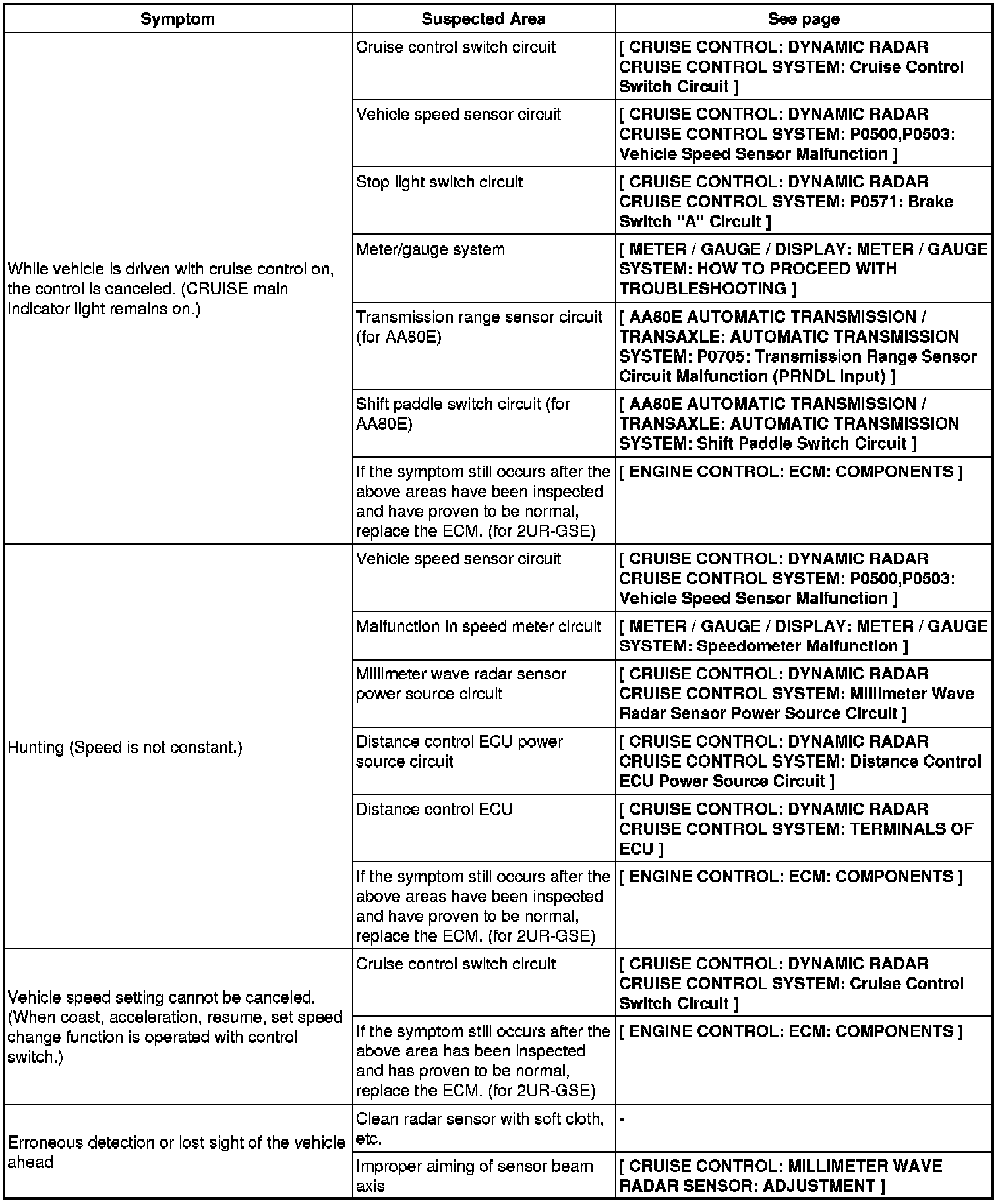CRUISE CONTROL: DYNAMIC RADAR CRUISE CONTROL SYSTEM: PROBLEM SYMPTOMS TABLE
