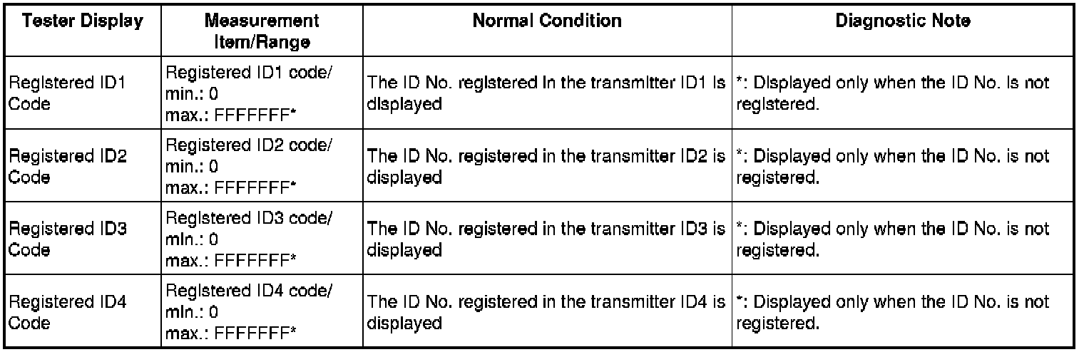 (1) When replacing a tire pressure warning valve and transmitter, each ID numbers of tire pressure waring valve and transmitters must be registered. Even if only one tire pressure warning valve and transmitter is replaced, the ID numbers of all the tire pressure warning valve and transmitters must be registered again. Record all existing ID numbers before beginning the process to enter new ID numbers.