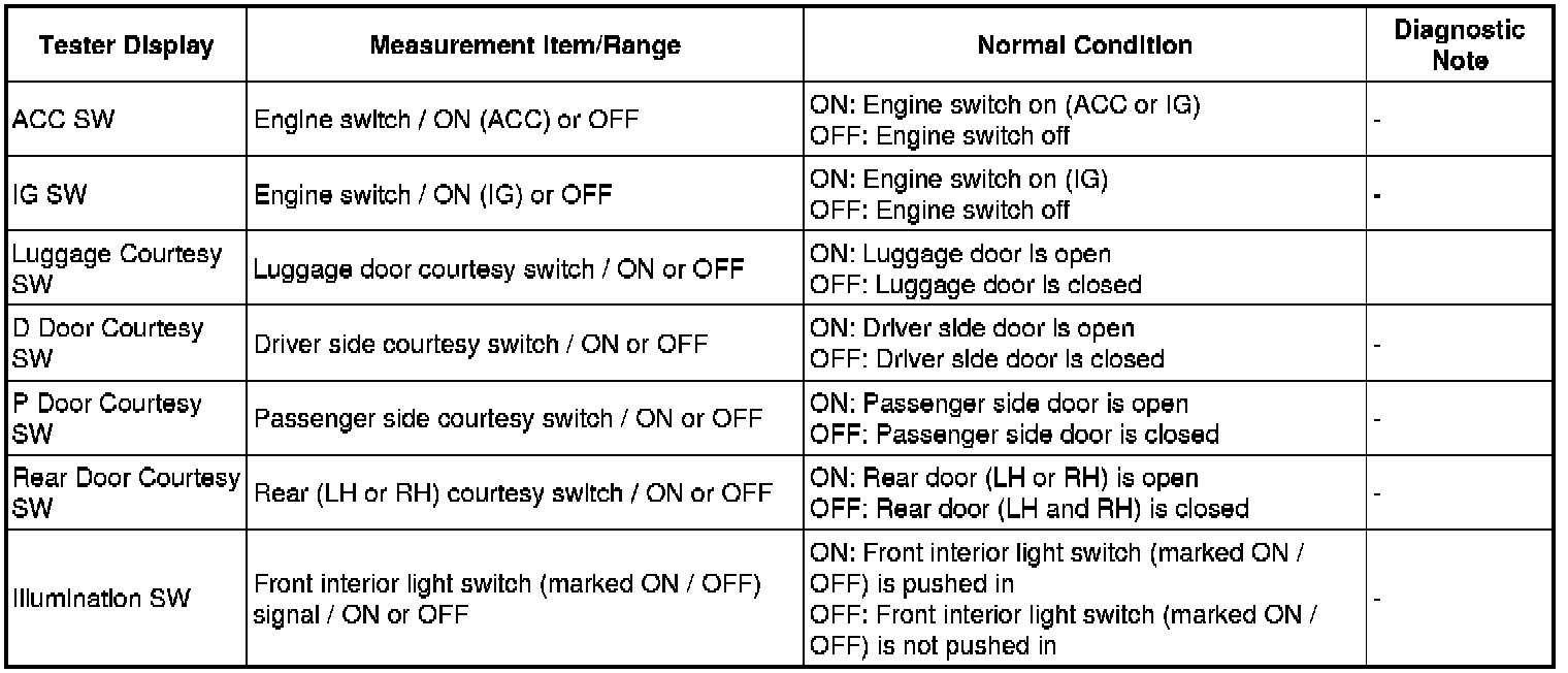 Using the Techstream to read the Data List allows the values or states of switches, sensors, actuators and other items to be read without removing any parts. This non-intrusive inspection can be very useful because intermittent conditions or signals may be discovered before parts or wiring is disturbed. Reading the Data List information early in troubleshooting is one way to save diagnostic time.