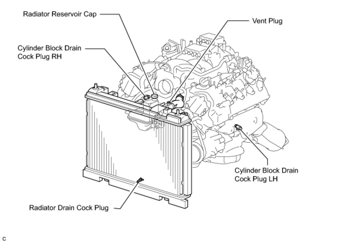 Do not loosen the radiator drain cock plug while the engine and radiator are still hot. Pressurized, hot engine coolant and steam may be released and cause serious burns.