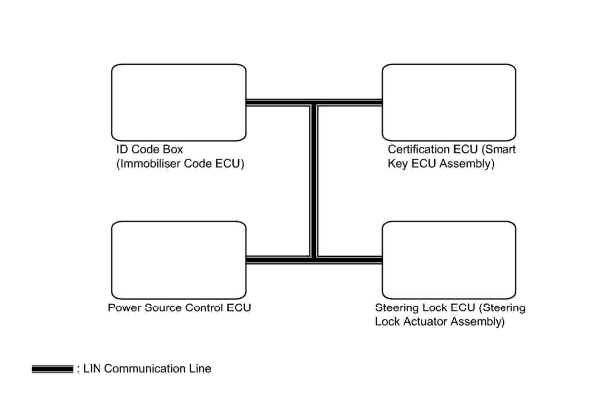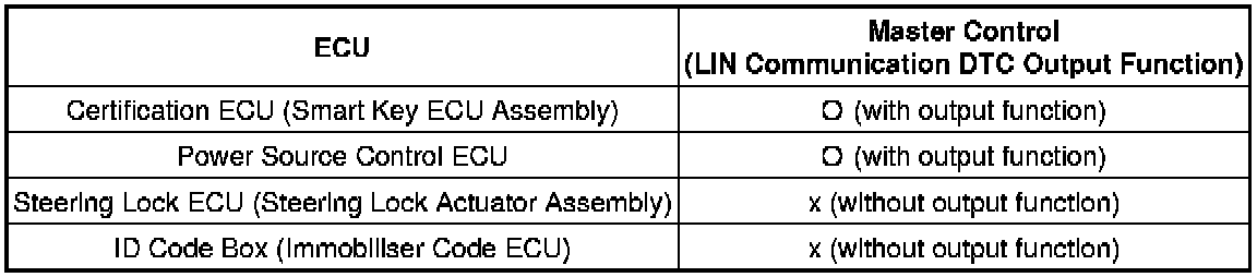 The multiplex communication system (LIN) is used to control communication between the ECUs of the body system. If communication cannot be performed through LIN because of an open in the communication lines or other reason, the master control ECU of the relevant system will output a DTC. For the communication system and the connected ECUs, refer to the table below.