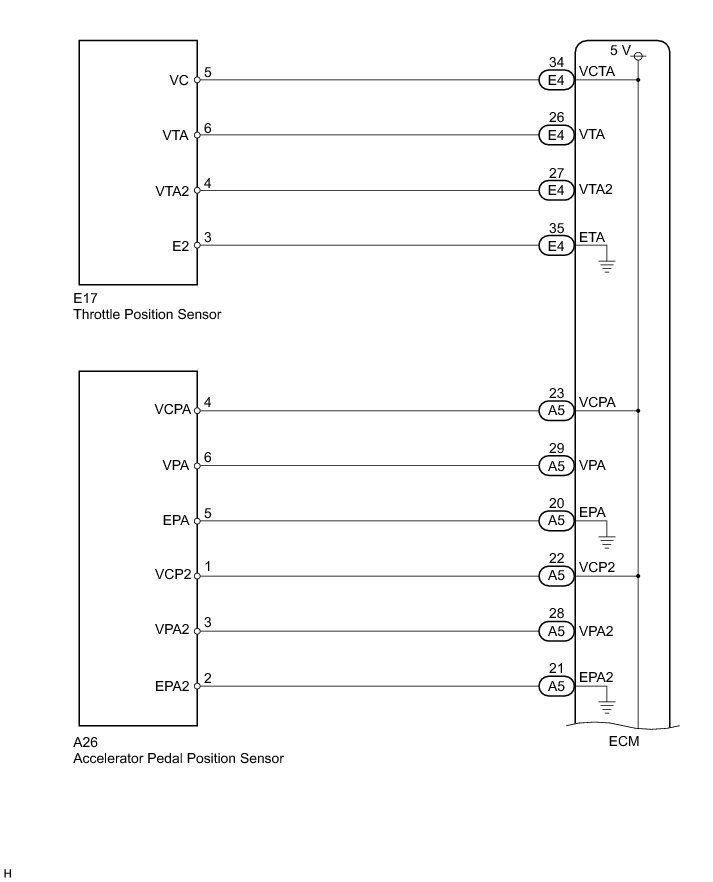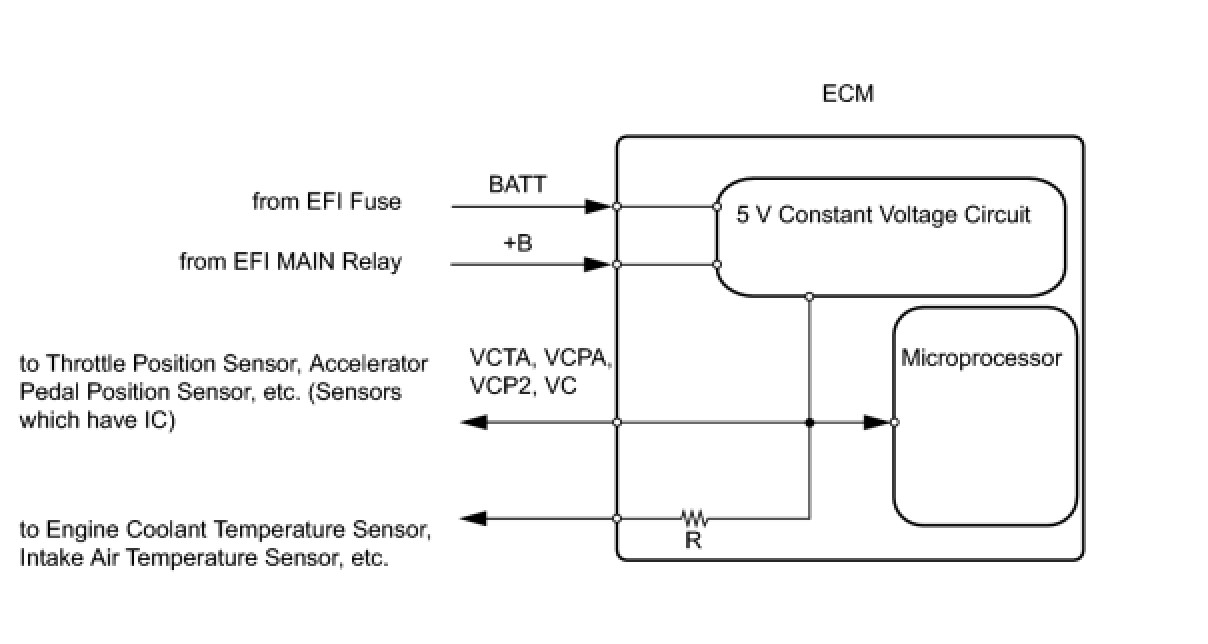 The ECM constantly uses 5 V from the battery voltages supplied to the +B (BATT) terminal to operate the microprocessor. The ECM also provides this power to the sensors through the VC output circuit.