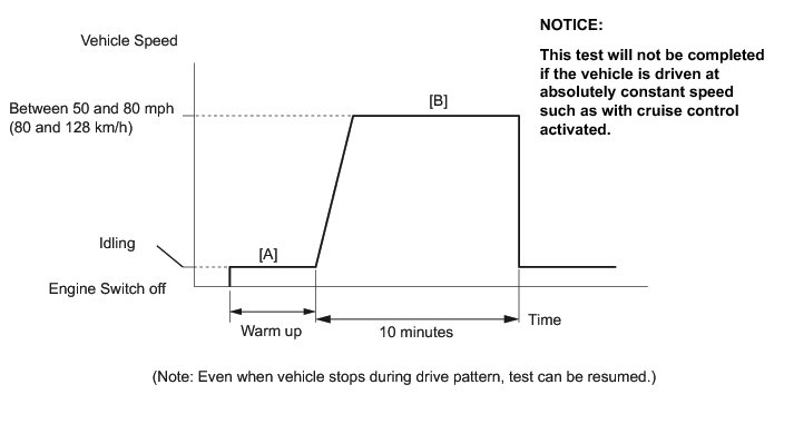 (6) Drive the vehicle at between 50 mph and 80 mph (80 km/h and 128 km/h) for at least 10 minutes [B].