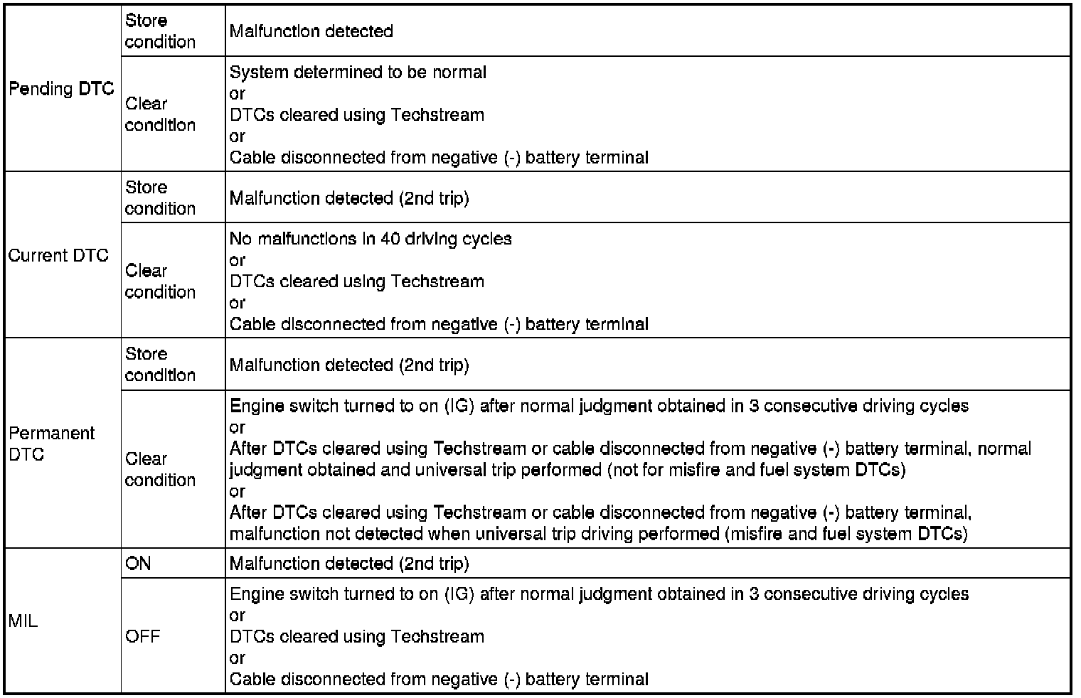 * Current and pending DTCs can be cleared by using the Techstream or by disconnecting the cable from the negative battery terminal. However, permanent DTCs cannot be cleared using either of these two methods.