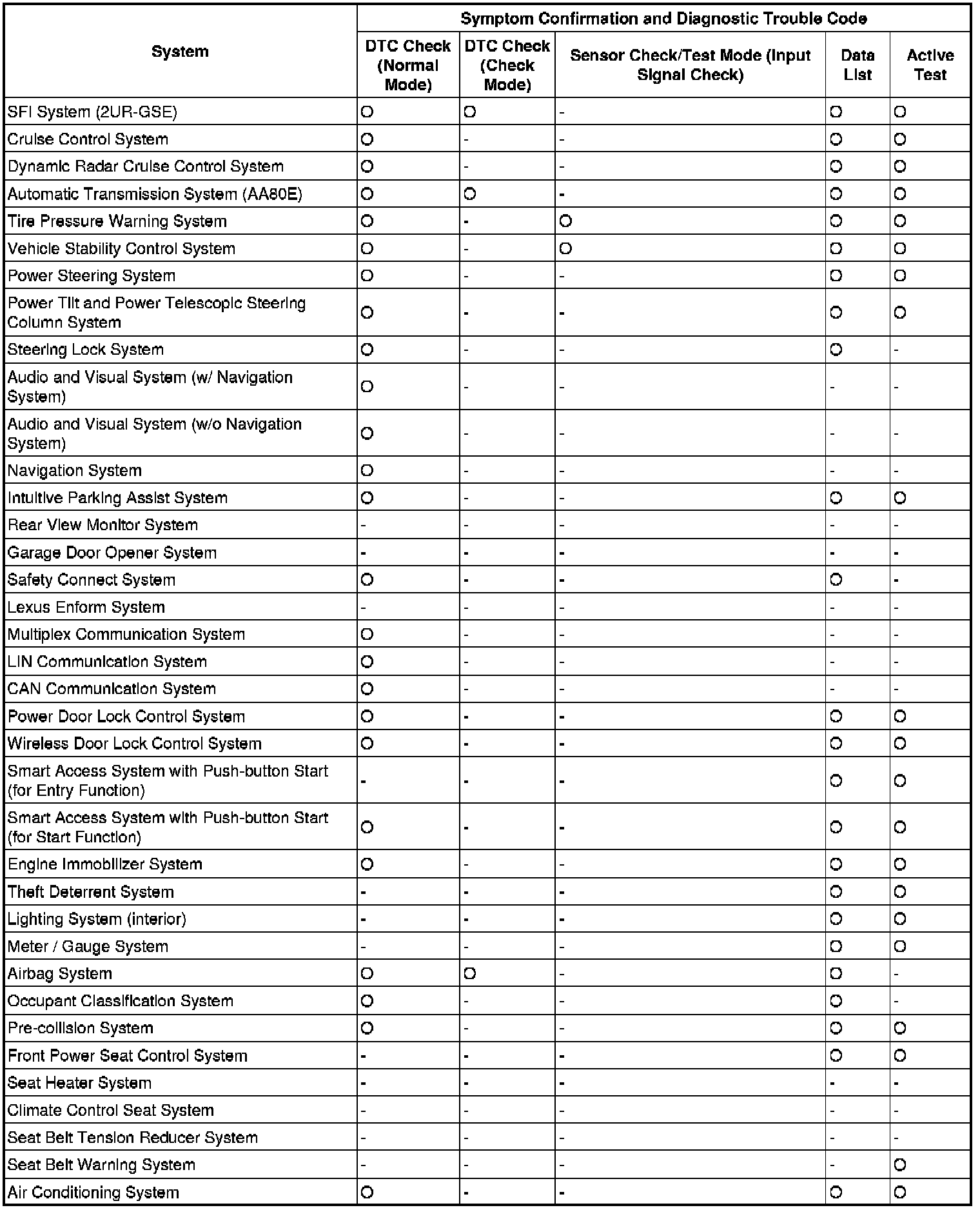 When no DTC is output but the problem still occurs, use the Problem Symptoms Table. The suspected areas (circuits or parts) for each problem symptom are shown in the table. The suspected areas are listed in order of probability. A description of each of the table columns is shown in the following table.