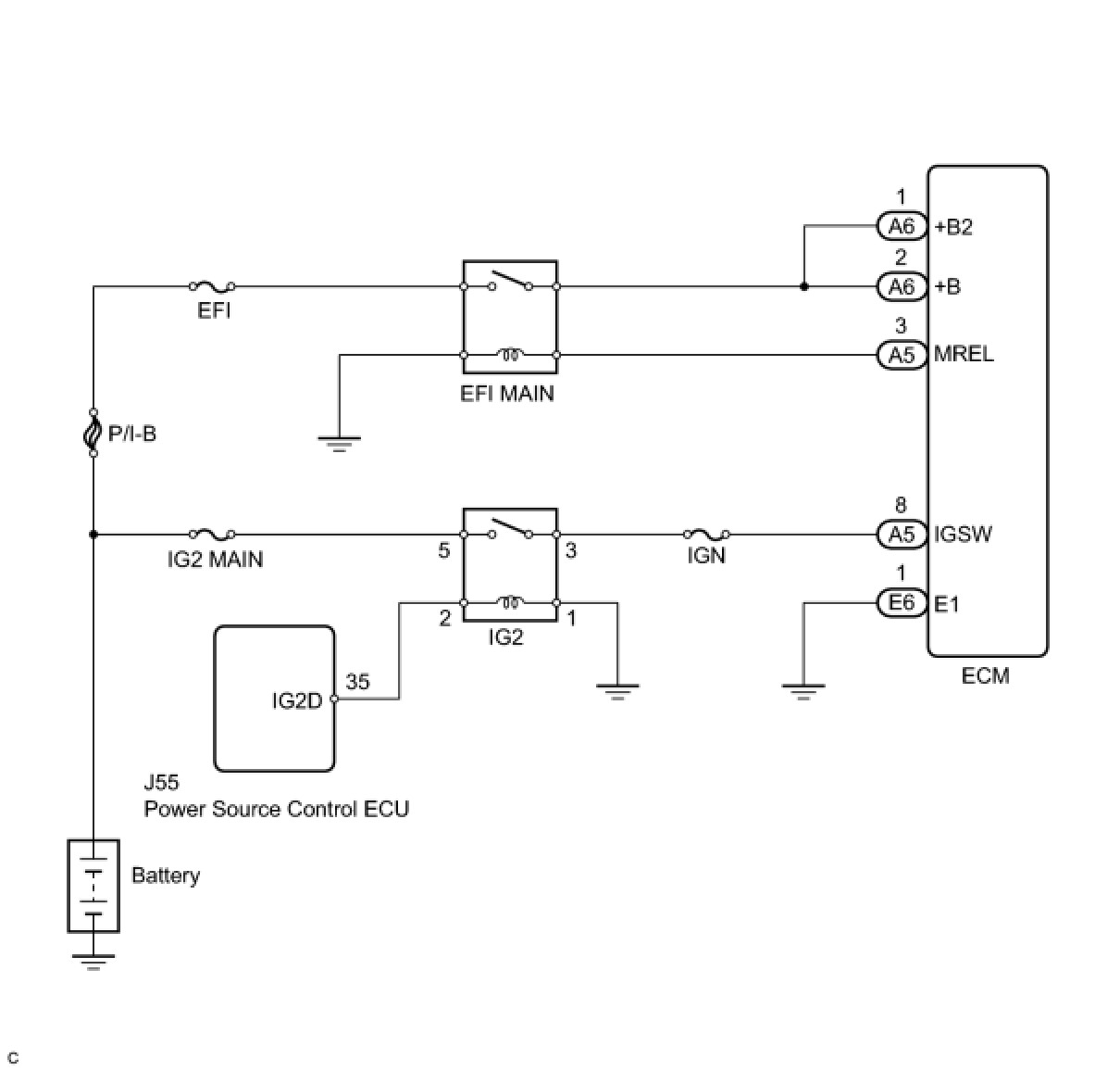 When the engine switch is turned on (IG), voltage from the ECM's MREL terminal is applied to the EFI relay (EFI MAIN2). This causes the contacts of the EFI relay (EFI MAIN2) to close, which supplies power to terminal +B and +B2 of the ECM.