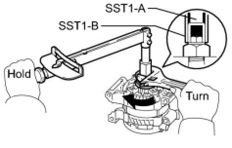 (d) While holding SST1-A on the pulley shaft area, tighten SST1-B to the specified torque.