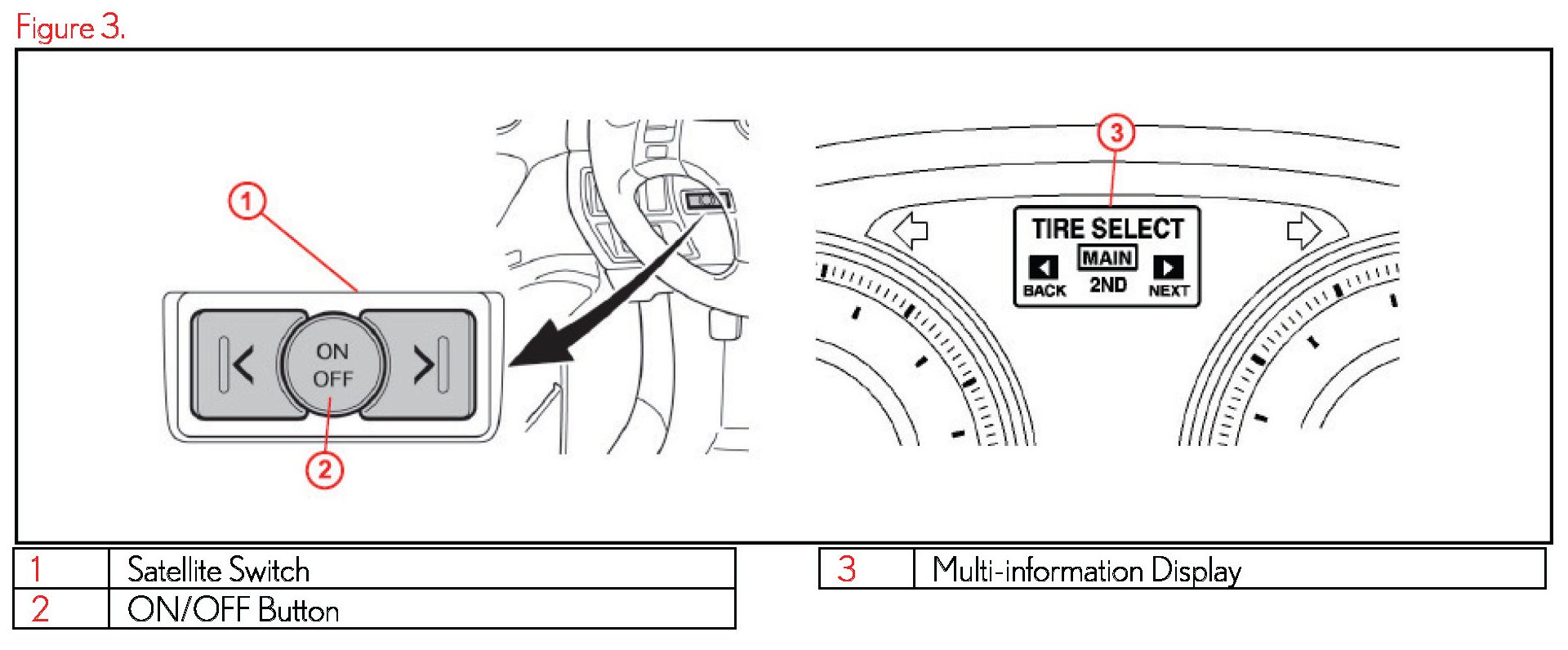 3. Press and hold either the right or left side of the satellite switch until the multi-information display for "TIRE SELECT" appears. Check that "MAIN" is selected.