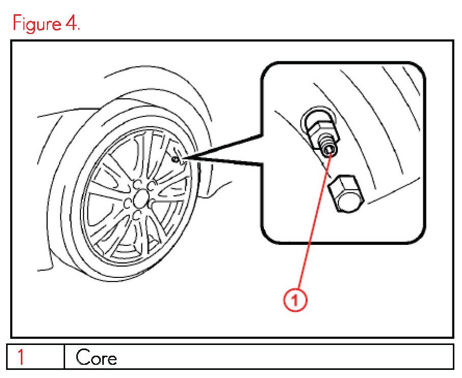 4. Press or remove the valve core to reduce the tire inflation pressure rapidly by 6 psi (0.4 kgf/cm2, 40 kPa), or more, within 30 seconds.