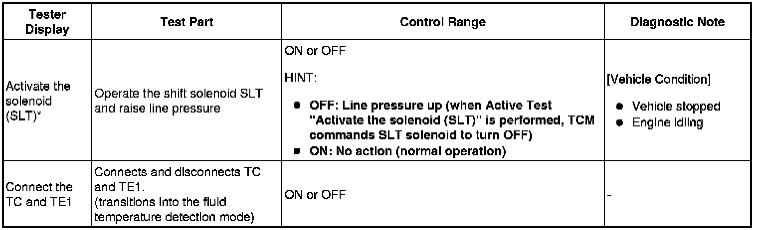 (g) *: The "Activate the solenoid (SLT)" Active Test is performed to allow confirmation that the line pressure changes. The line pressure changes are confirmed using the same SST that is used for the Hydraulic Test Hydraulic Test.