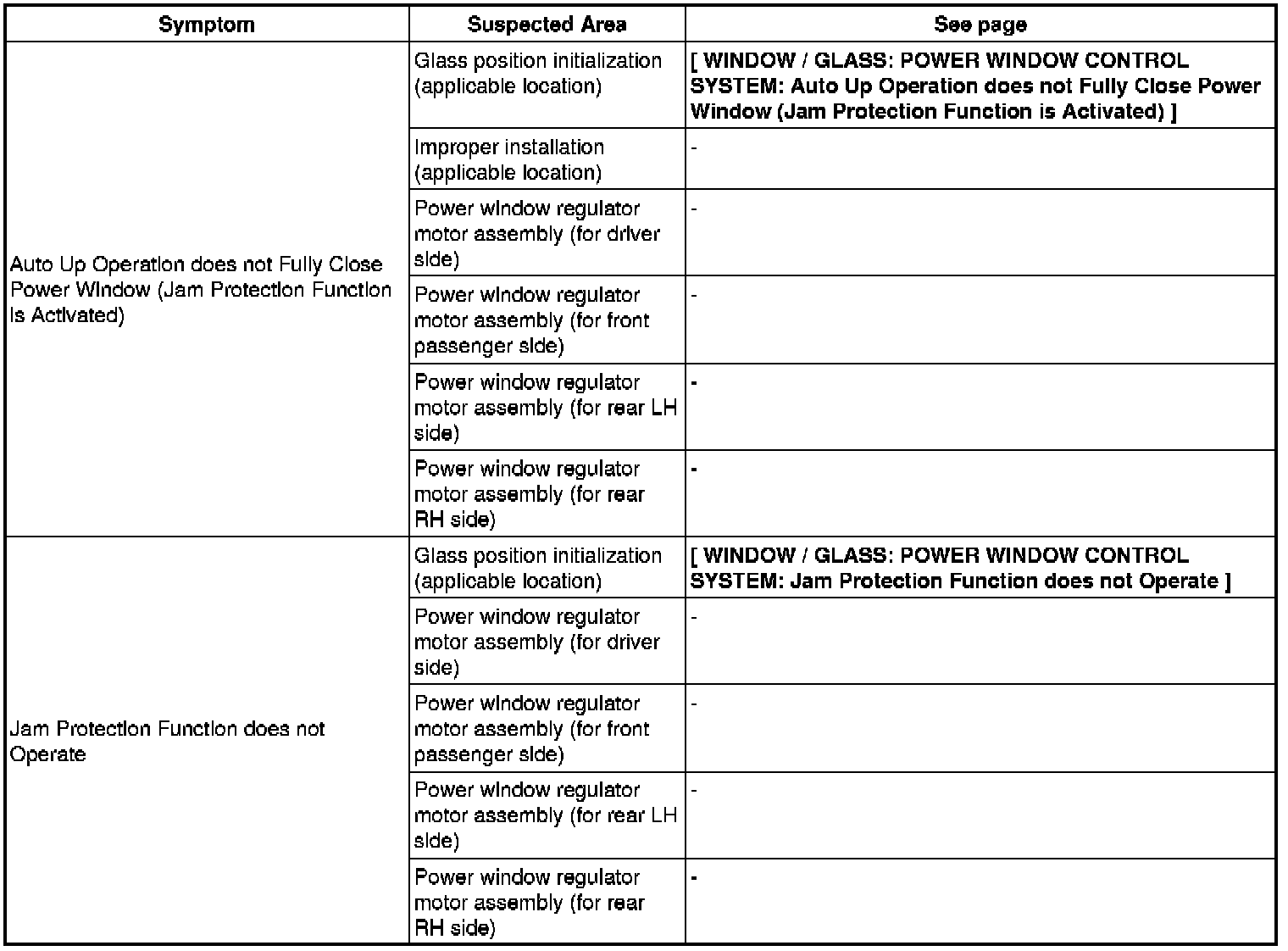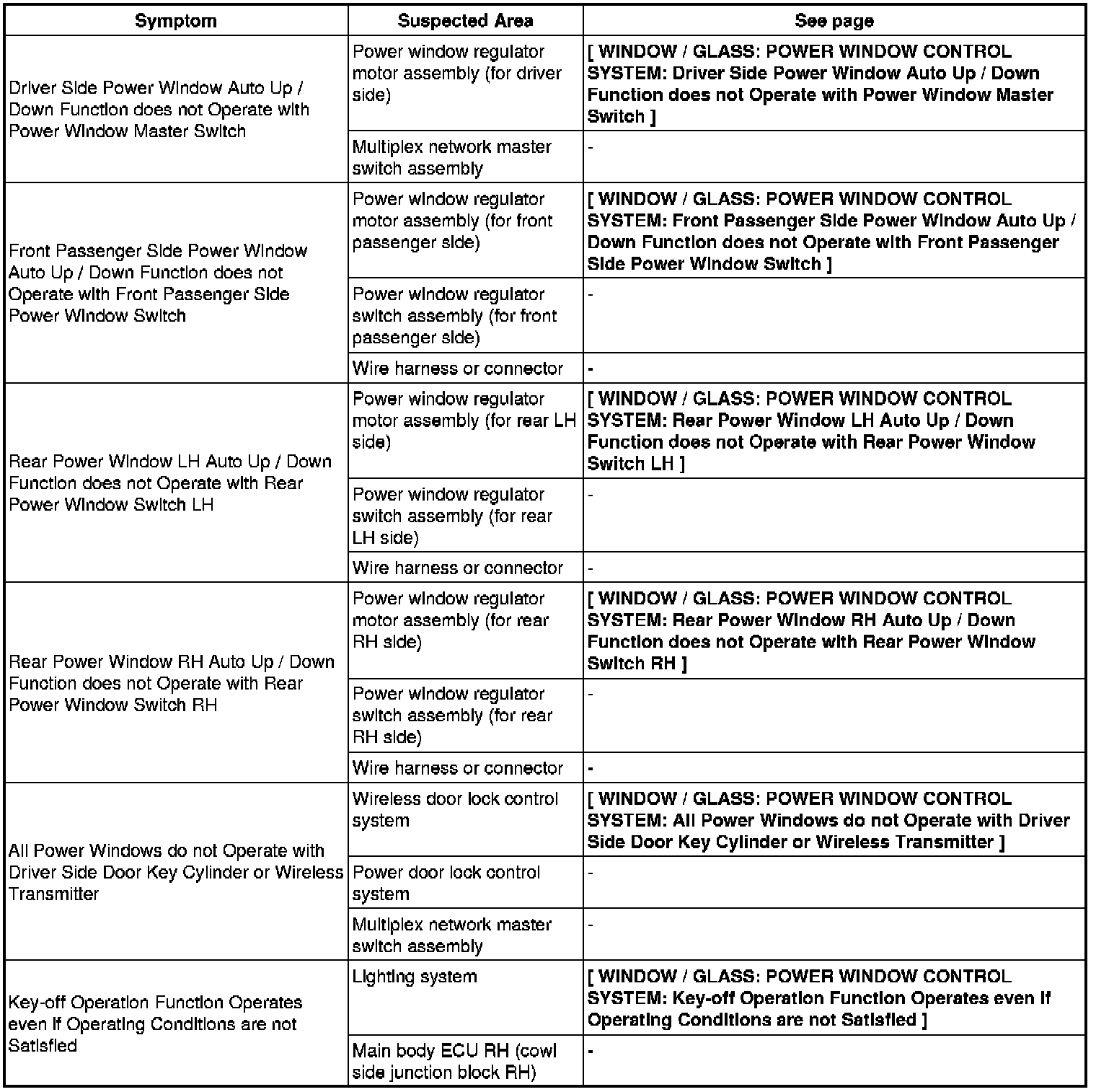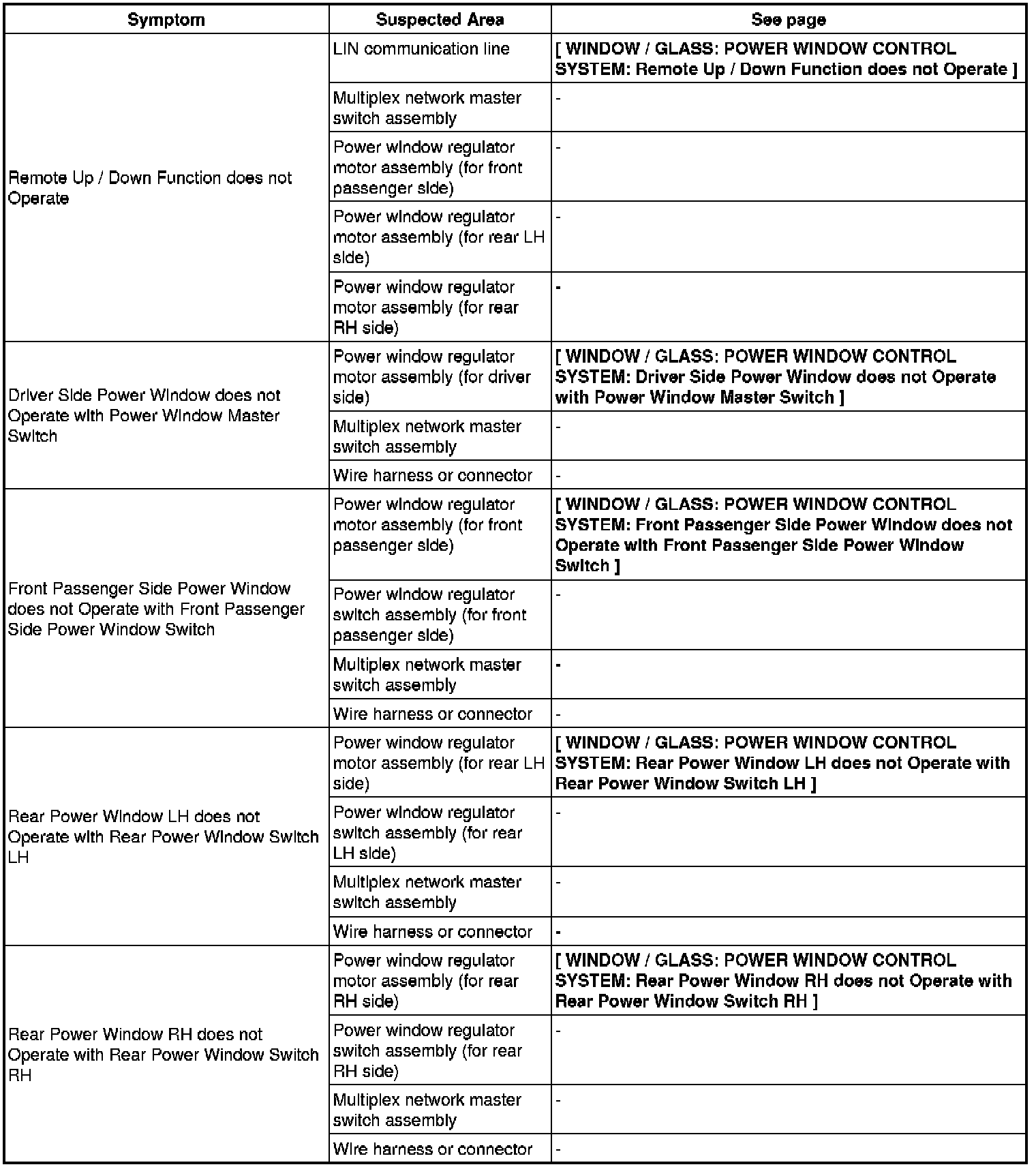 WINDOW / GLASS: POWER WINDOW CONTROL SYSTEM: PROBLEM SYMPTOMS TABLE