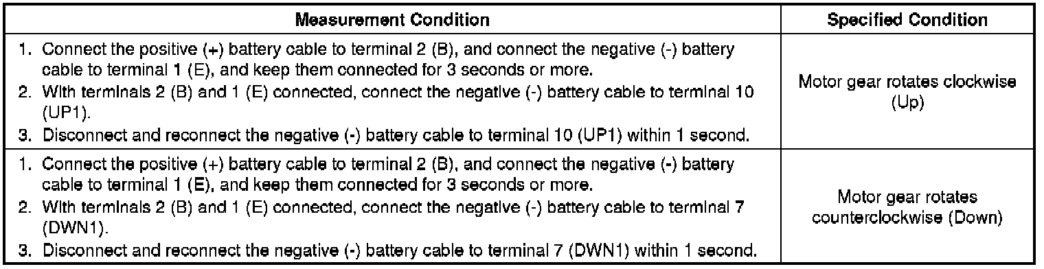 (b) Apply negative (-) battery voltage to connector terminals 1 (E) and 7 (DWN1) or 10 (UP1).