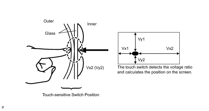 (a) Touch switches are touch-sensitive (interactive) switches operated by touching the screen. When a switch is pressed, the outer glass bends to contact the inner glass at the pressed position. By doing this, the voltage ratio is measured and the pressed position is detected.