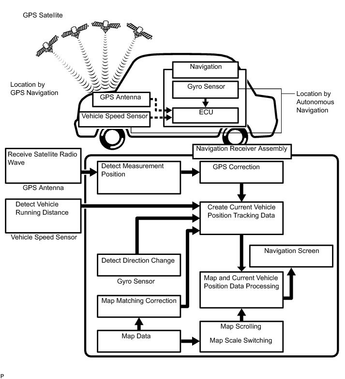 (1) It is essential that the navigation system correctly tracks the current vehicle position and displays it on the map. There are 2 methods to track the current vehicle position: autonomous (dead reckoning) and GPS* (satellite) navigation. Both navigation methods are used in conjunction with each other.