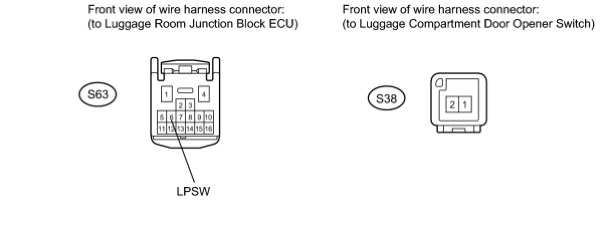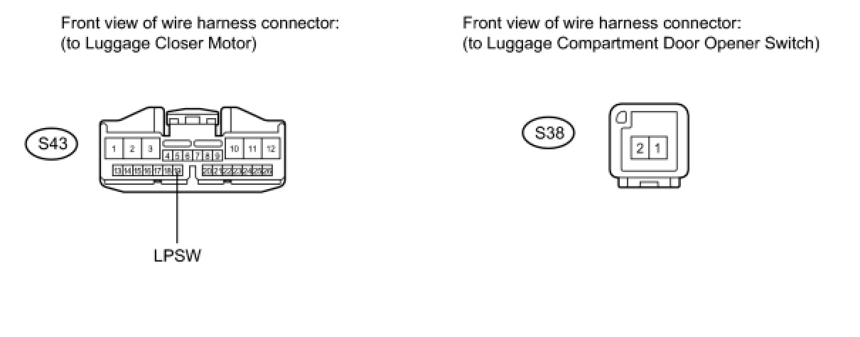 18. CHECK HARNESS AND CONNECTOR (LUGGAGE COMPARTMENT DOOR OPENER SWITCH - LUGGAGE DOOR CLOSER MOTOR)