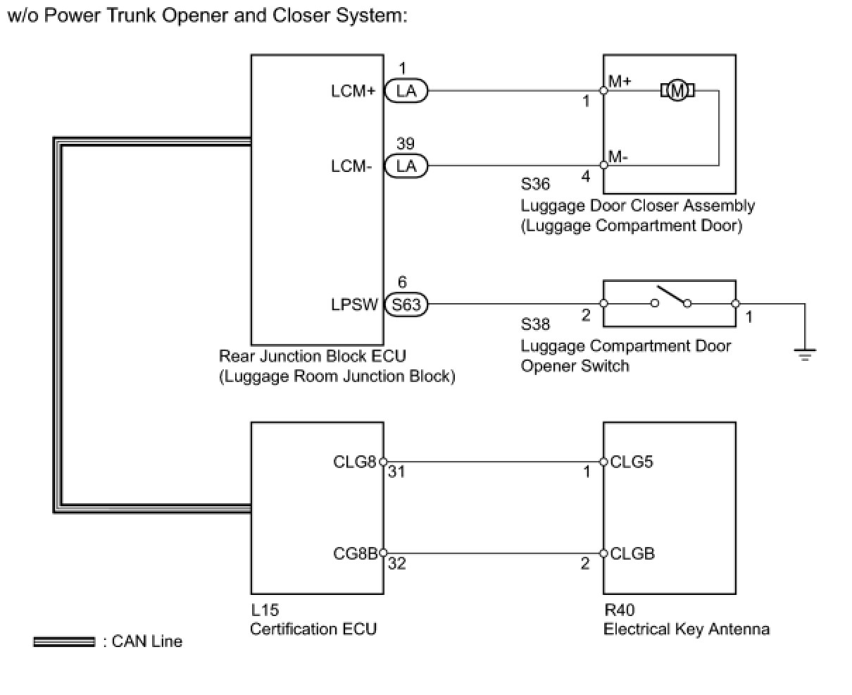 When the entry luggage compartment open function does not operate, one of the following may be the cause: 1) luggage compartment door opener switch malfunction; 2) luggage opener system (w/o power trunk opener and closer system) or power trunk opener and closer system (w/ power trunk opener and closer system) malfunction; 3) communication malfunction between electrical key antenna and electrical key transmitter; 4) the luggage junction block ECU (w/o power trunk opener and closer system) or power trunk opener and closer ECU (luggage closer motor (w/ power trunk opener and closer system)) receives the luggage compartment door opener switch ON signal, but is unable to send the signal to the certification ECU through CAN communication; or 5) certification ECU malfunction.