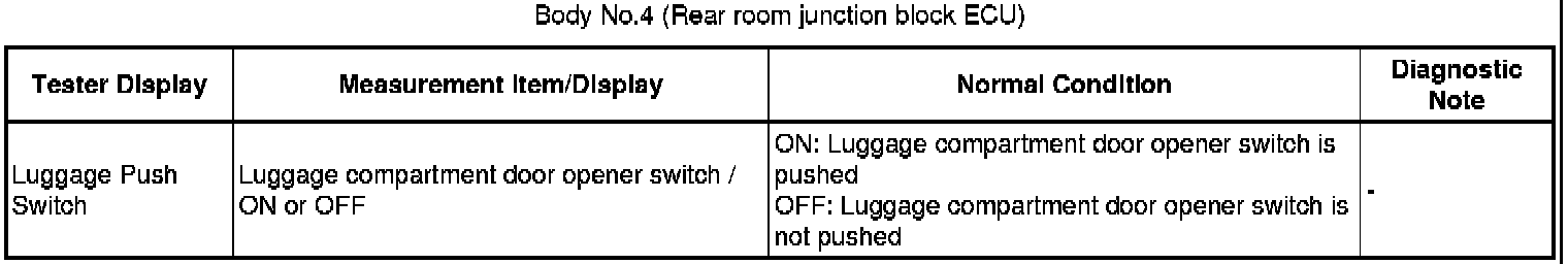 For vehicles with the power trunk opener and closer system, the Data List of the power trunk opener and closer ECU can be used to check the luggage compartment door opener switch information. For vehicles without the power trunk opener and closer system, the Data List of the luggage room junction block ECU can be used to check the luggage compartment door opener switch information.