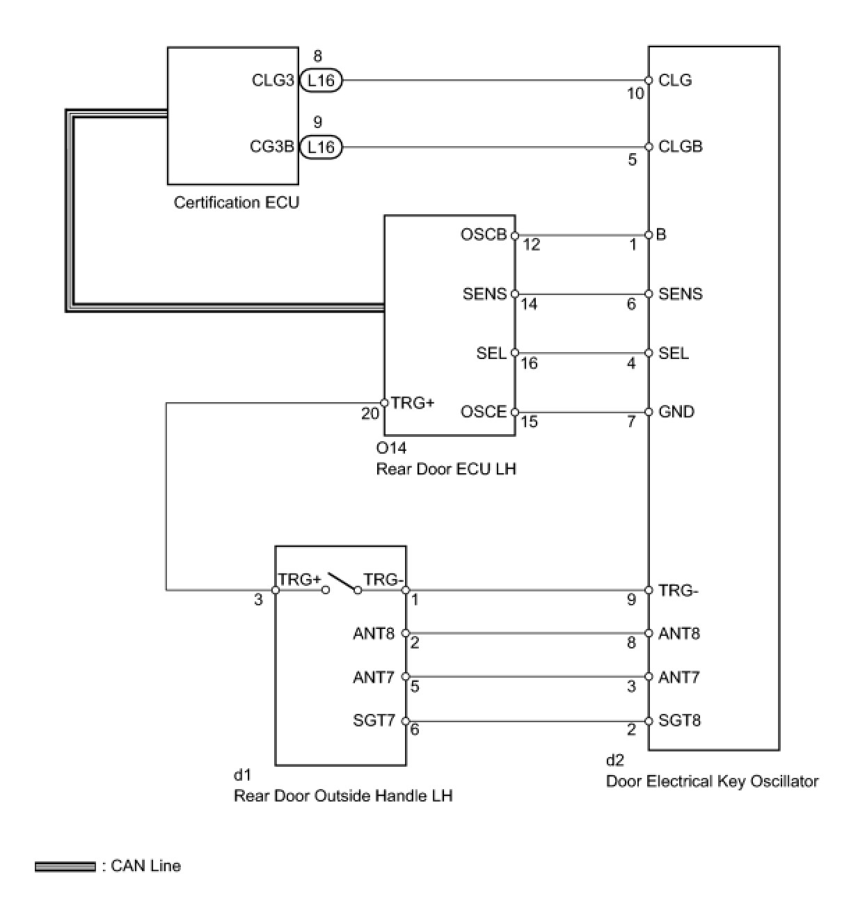 When the rear door LH entry lock and unlock functions do not operate, one of the following may be malfunctioning: 1) power door lock system, 2) rear door LH electrical key oscillator, or 3) certification ECU.