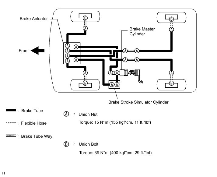 Refer to the diagram below to confirm the locations and tightening torque of the flexible hoses and brake tubes.