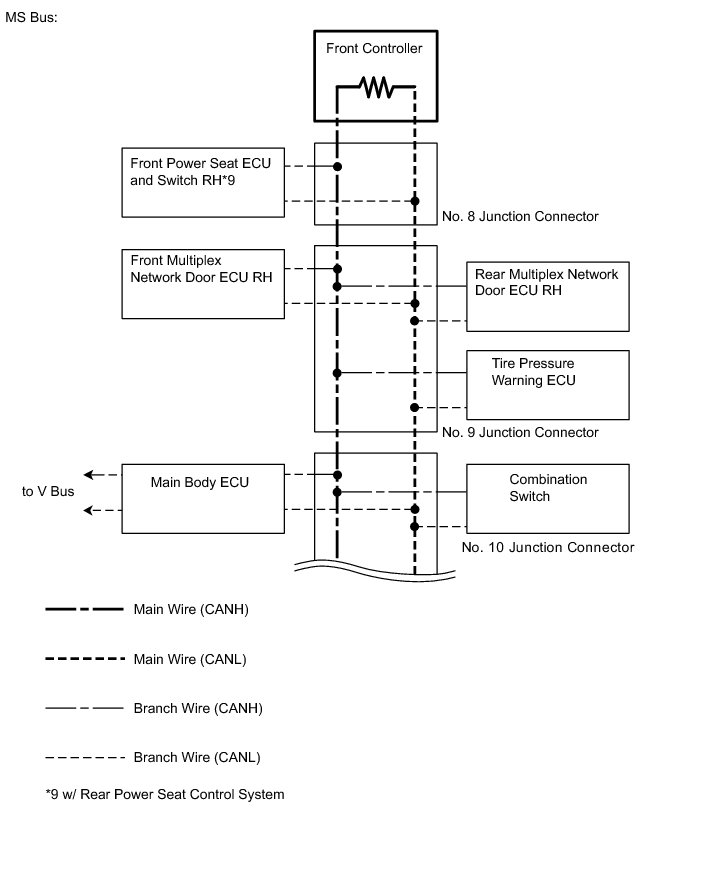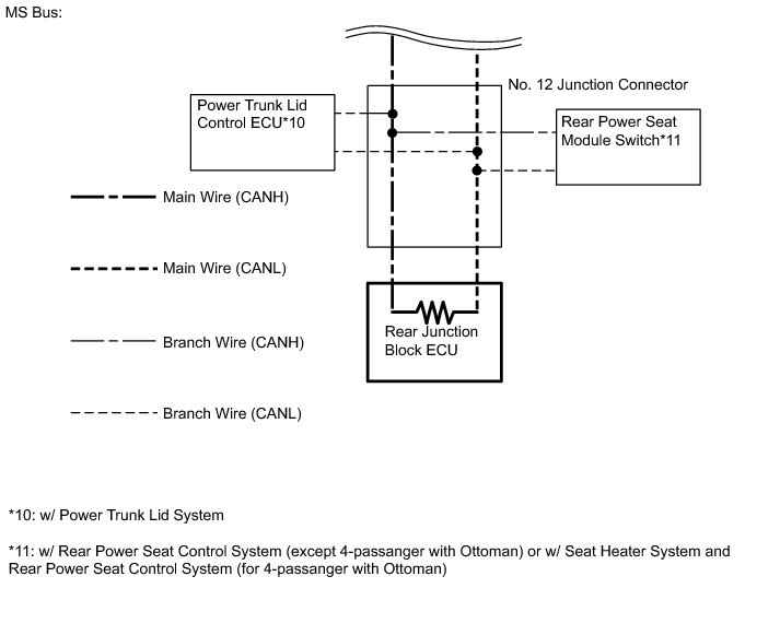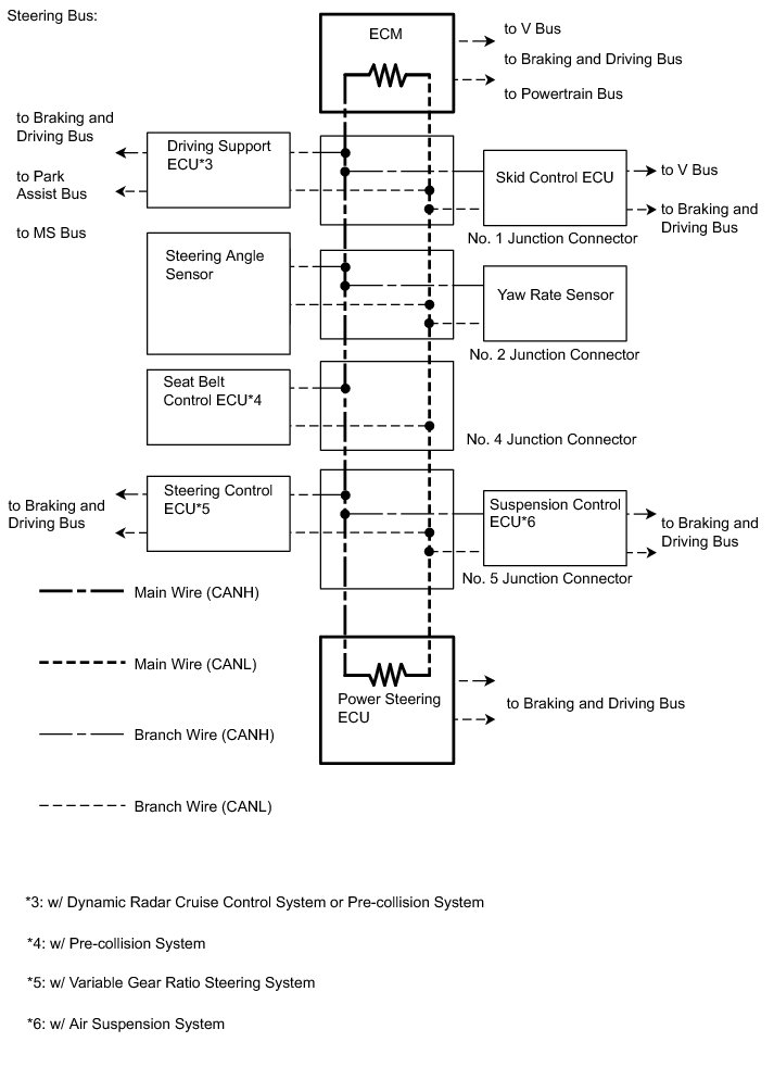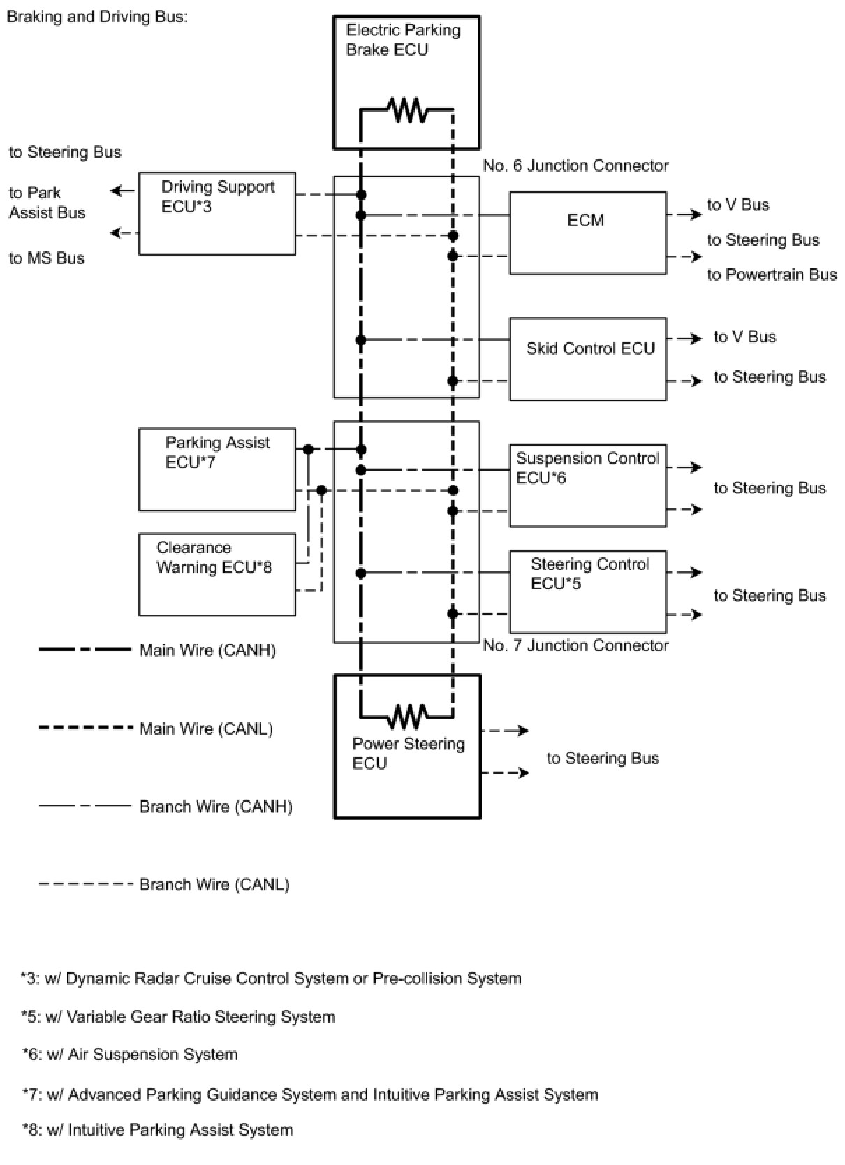(a) The V bus, steering bus, braking and driving bus, parking assist bus, powertrain bus and MS bus each have termination circuits with 120 Ohms x 2 of resistance. High speed communication at 500 kbps and 250 kbps is possible.