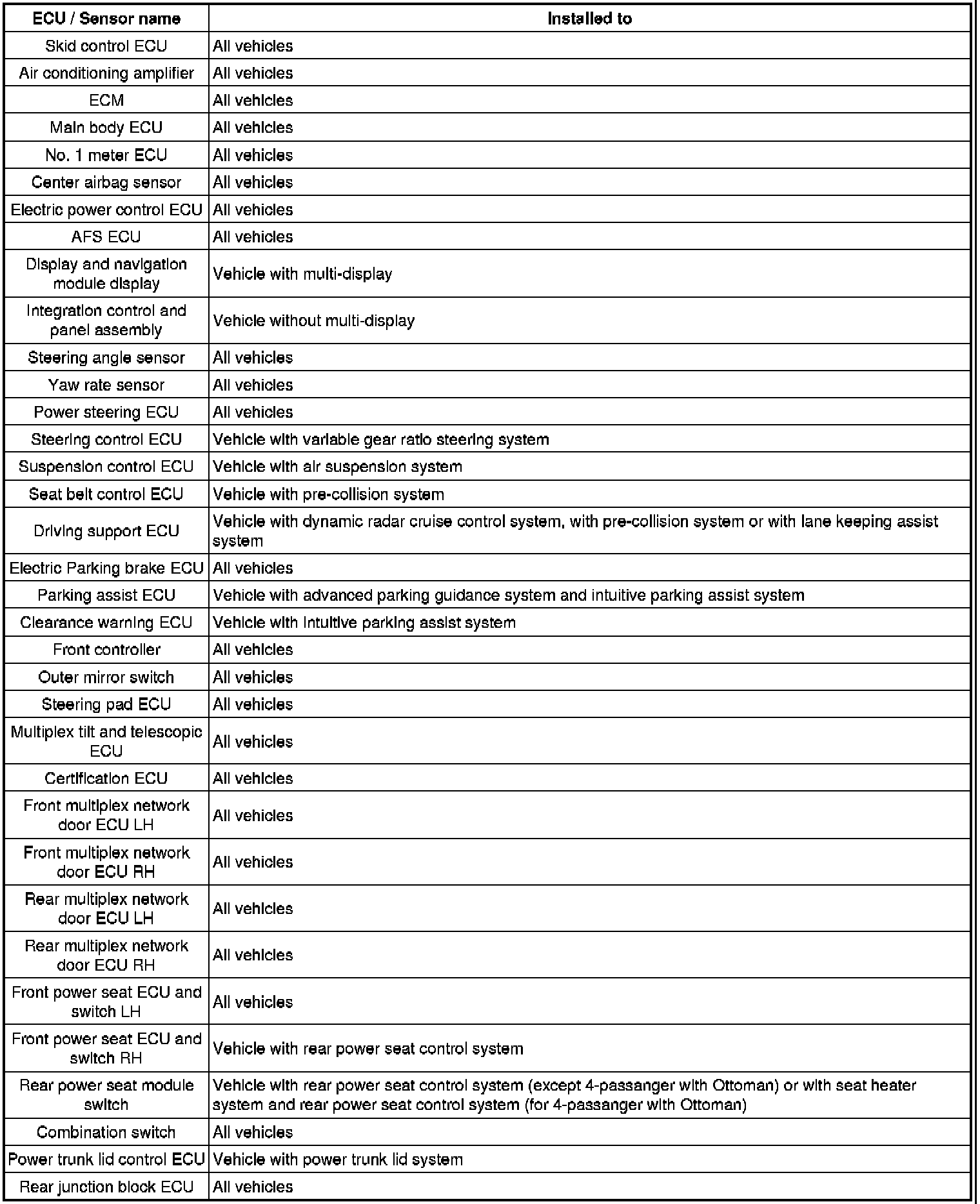 (a) System (ECUs and sensors) that use CAN communication vary depending on the vehicle's optional settings. Check which systems (ECUs and sensors) are installed on the vehicle.