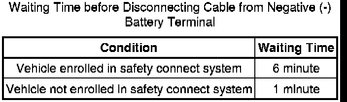 Wait at least 90 seconds after disconnecting the cable from the negative (-) battery terminal to prevent airbag and seat belt pretensioner activation.