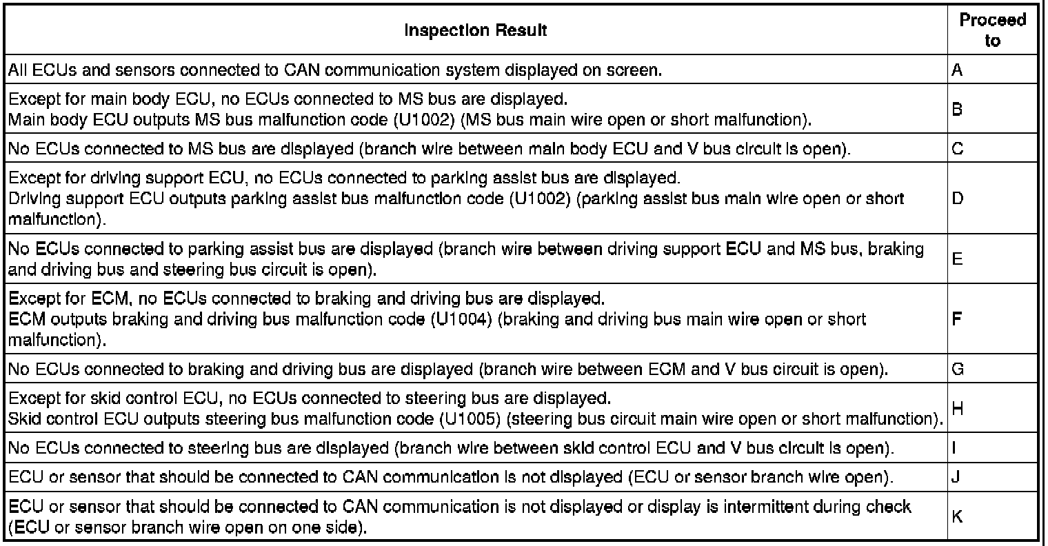 * The gateway ECU built into the ECM may be malfunctioning if both of the following occurs: 1) all ECUs connected to the braking and driving bus are not displayed on the Techstream; and 2) DTC U1004 is not output.