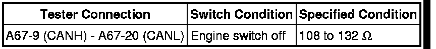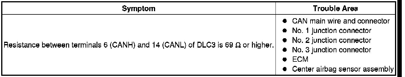 There may be an open circuit in the CAN main wire and/or the DLC3 branch wire when the resistance between terminals 6 (CANH) and 14 (CANL) of the DLC3 is 69 Ohms or higher.