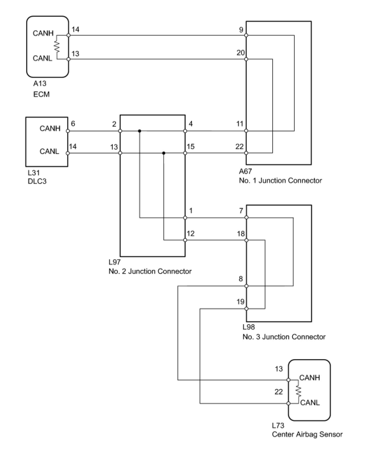 14. CHECK FOR OPEN IN CAN BUS MAIN WIRE (CENTER AIRBAG SENSOR - NO. 3 JUNCTION CONNECTOR)