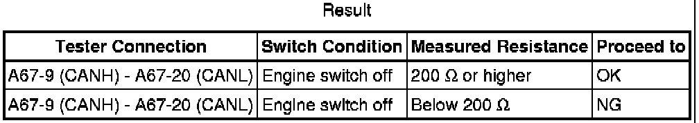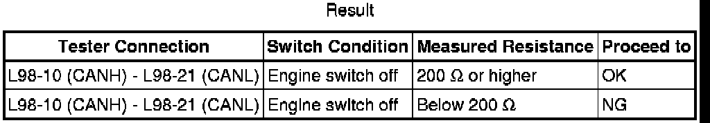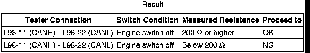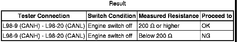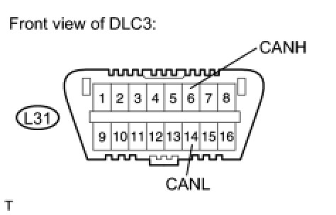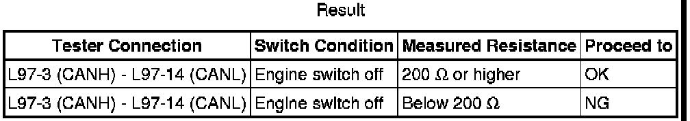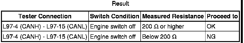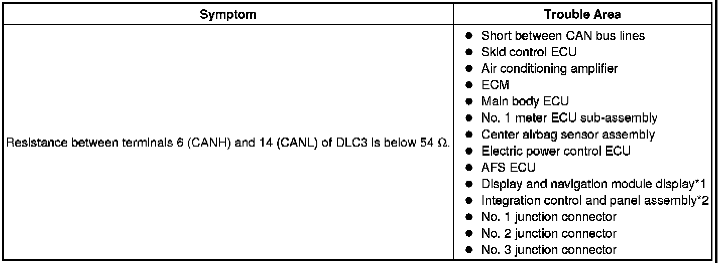 There may be a short circuit between the CAN bus lines when the resistance between terminals 6 (CANH) and 14 (CANL) of the DLC3 is below 54 Ohms.