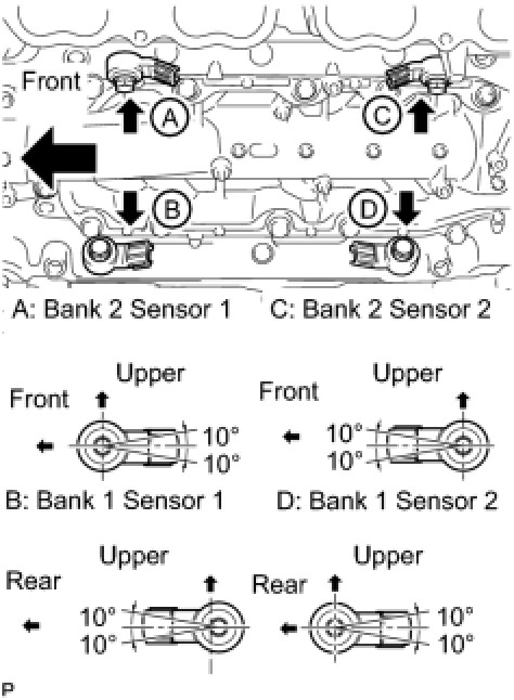 (a) Install the 4 knock sensors with the 4 bolts so that the sensors are angled as shown in the illustration.
