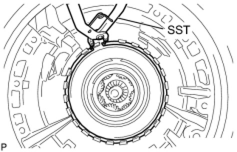 (b) Using needle-nose pliers, attach the snap ring to install the ring gear to the forward multiple disc clutch assembly.